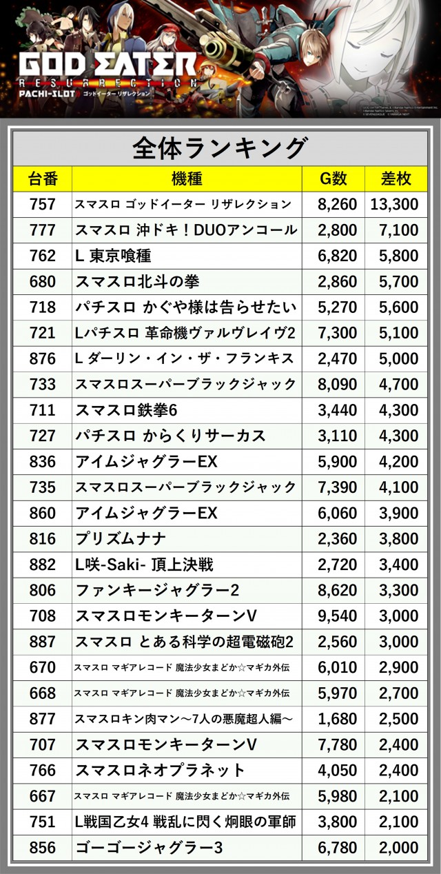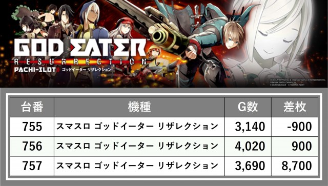 厳選された取材対象機種をはじめ、その他スロット全体から好記録が飛び出した!プレイヤーが楽しんだ1日を下記データにて振り返ってみて欲しい。