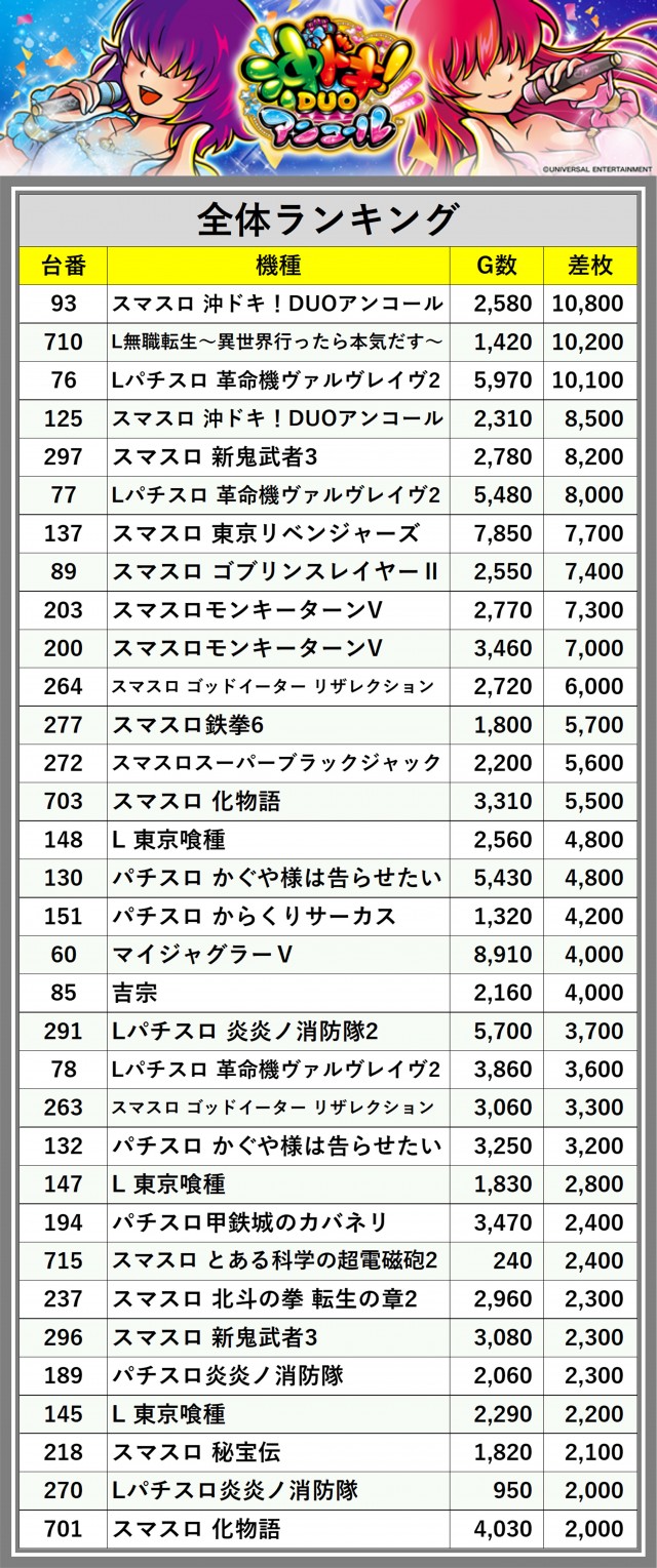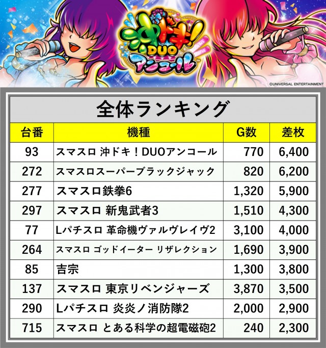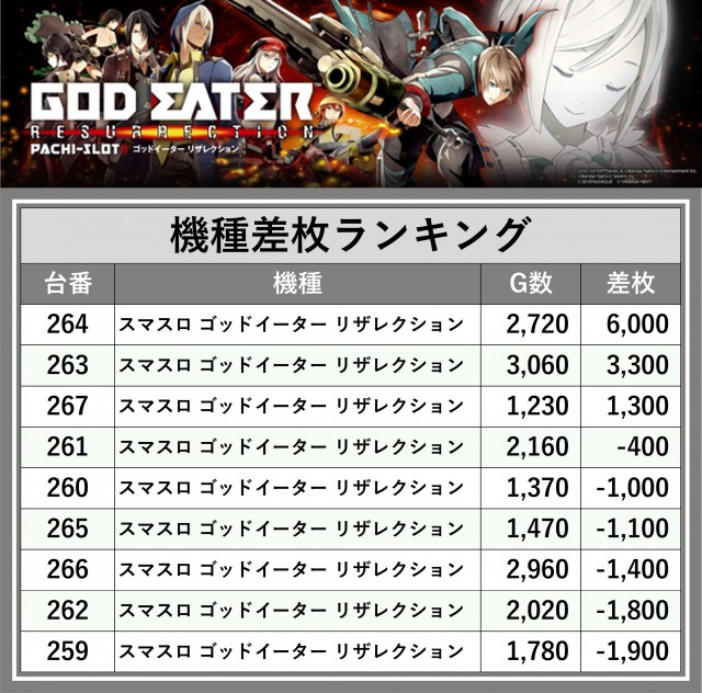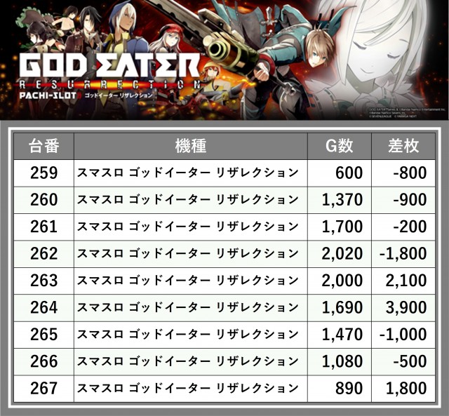 厳選された取材対象機種をはじめ、その他スロット全体から好記録が飛び出した!プレイヤーが楽しんだ1日を下記データにて振り返ってみて欲しい。