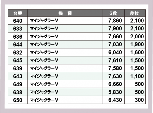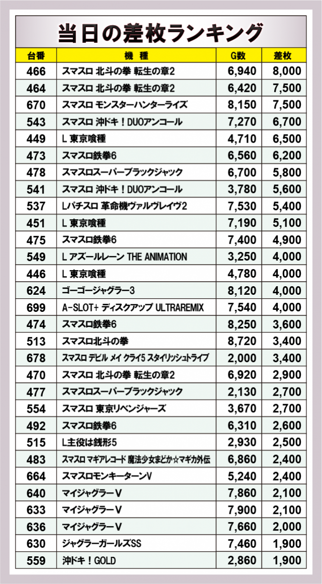 ※差枚数順に掲載しています