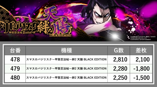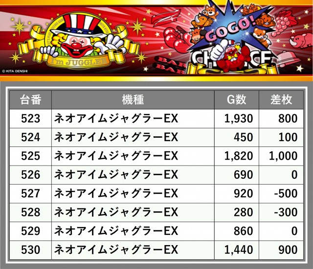 厳選された取材対象機種をはじめ、その他スロット全体から好記録が飛び出した!プレイヤーが楽しんだ1日を下記データにて振り返ってみて欲しい。