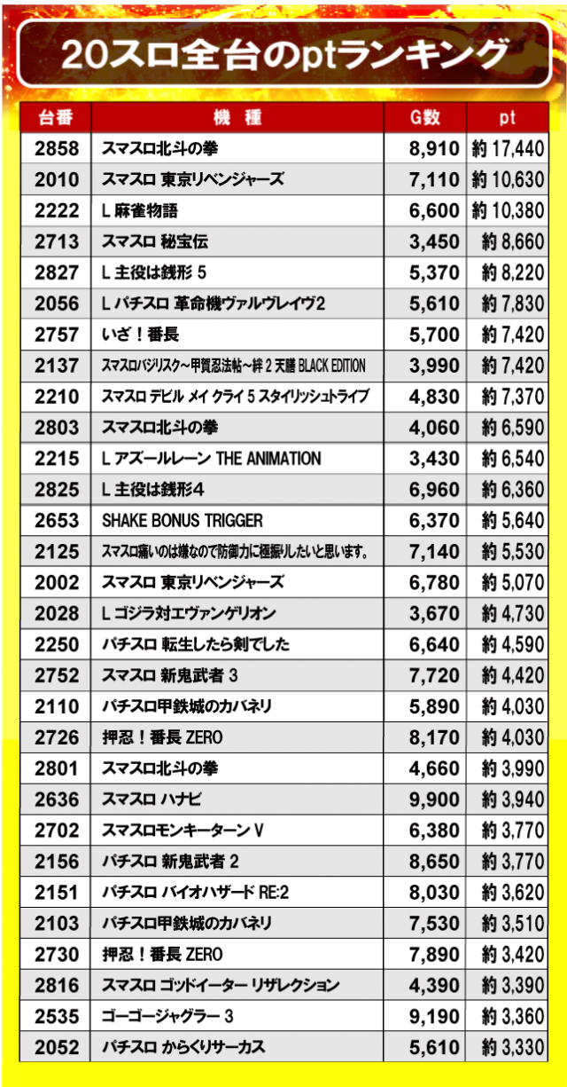 ①20スロ全台のptランキング