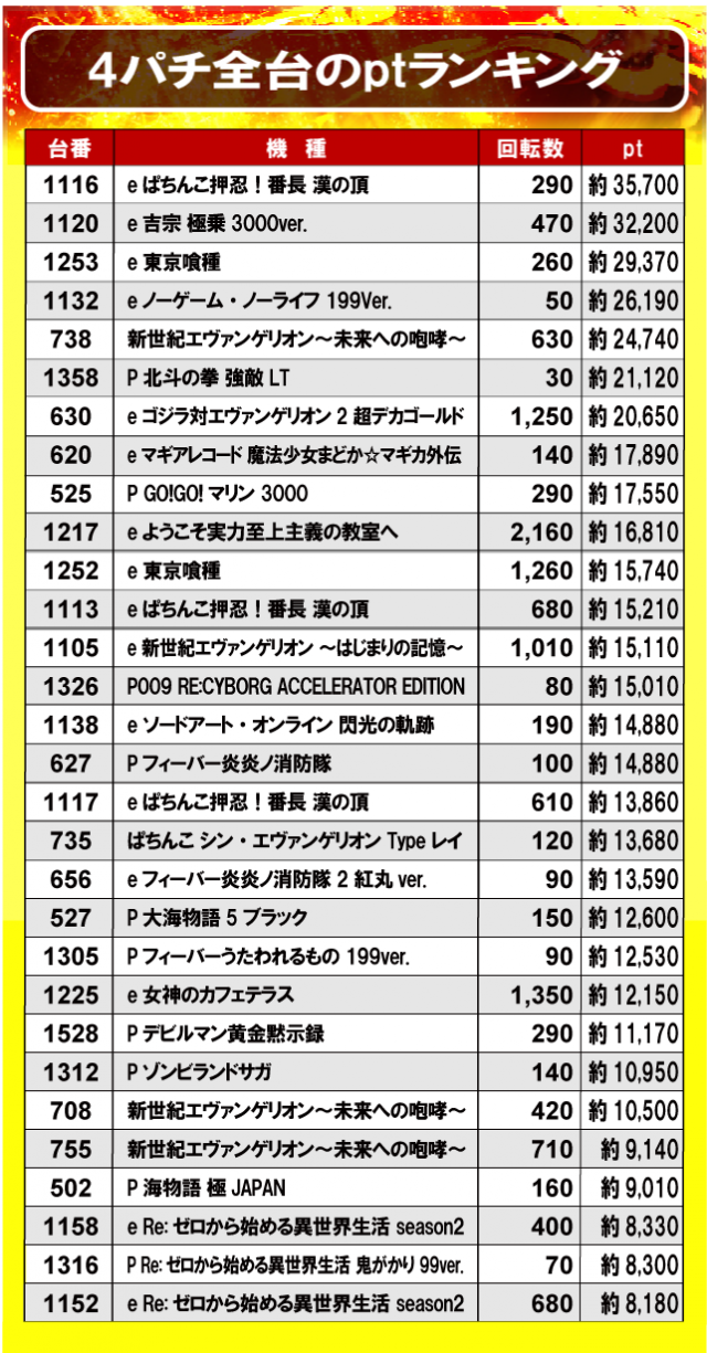 『eぱちんこ押忍!番長 漢の頂』が約35,700ptで首位に立ち、続いて『e吉宗 極乗3000ver.』が約32,200pt、『e 東京喰種』が約29,370ptと素晴らしい結果を残した!さまざまなタイプの機種が名を連ね、各所で好結果が相次いだ!