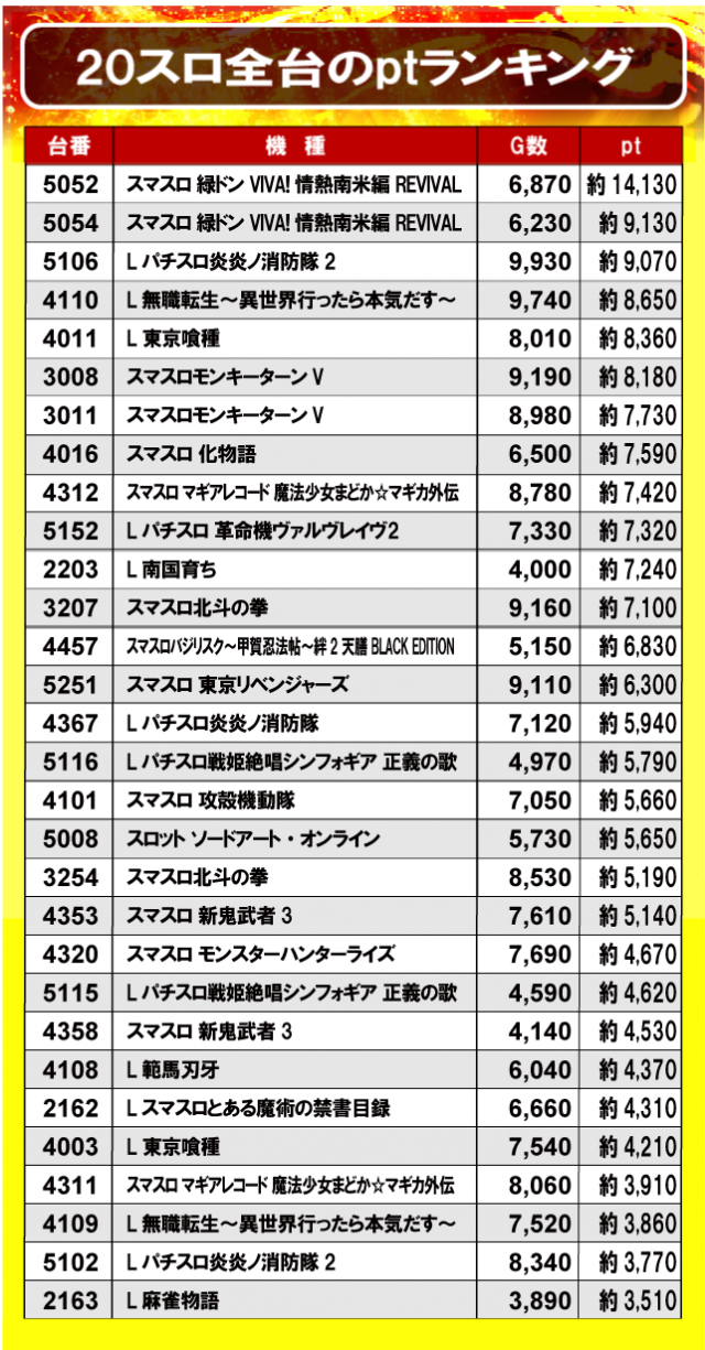 ①20スロ全台のptランキング