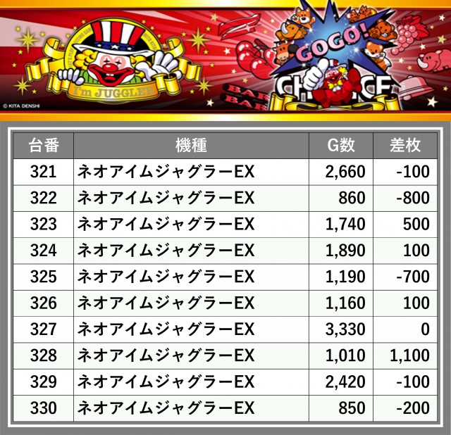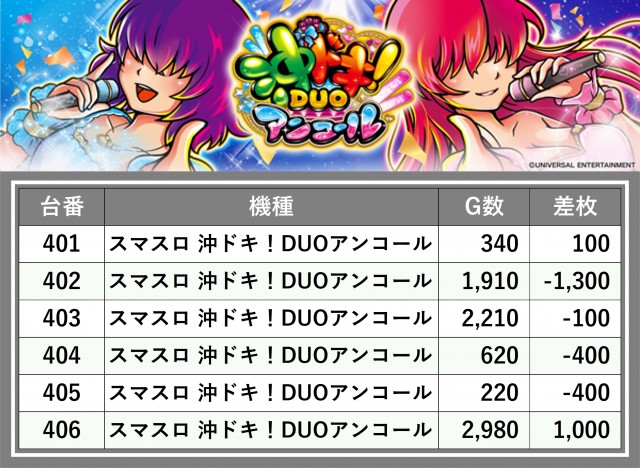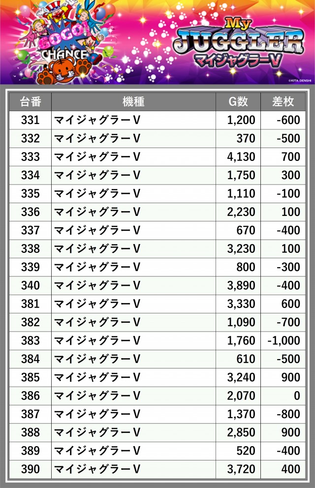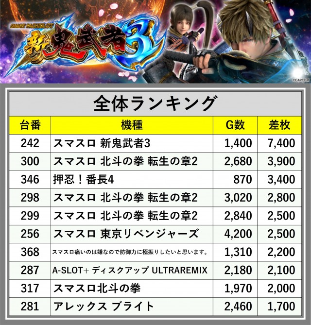 厳選された取材対象機種をはじめ、その他スロット全体から好記録が飛び出した!プレイヤーが楽しんだ1日を下記データにて振り返ってみて欲しい。