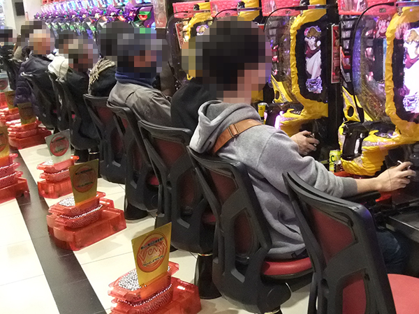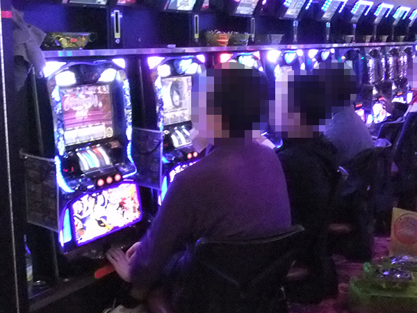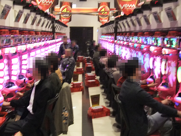 店内に入ると、朝イチはパチスロコーナーが大人気。「バジリスク~甲賀忍法帖~絆」やハナハナシリーズなどが、空き台も見当たらないほどの状況となっていた。