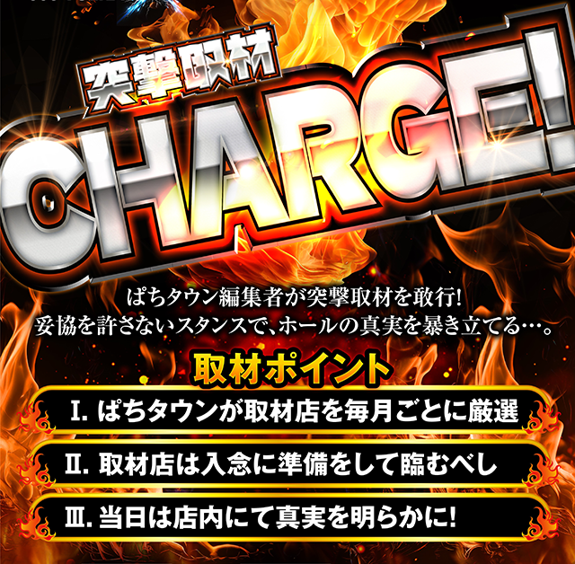 ぱちタウン編集部が取材ホールを厳選し、妥協することなくホールの真実に迫る「突撃取材CHARGE!」をおこなった。