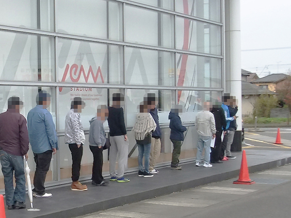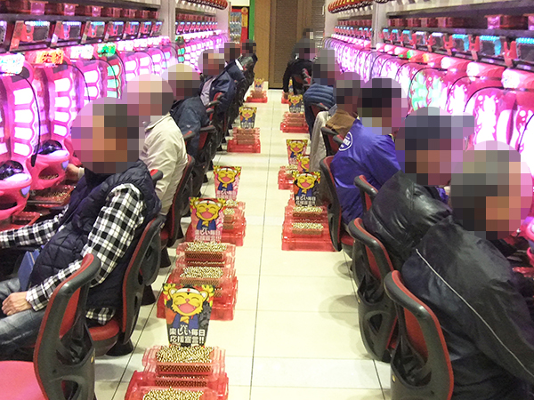 取材当日の朝は、開店前から多くのプレイヤーが集結。各人、希望に満ちた表情を浮かべつつ入店の瞬間を待っていた。