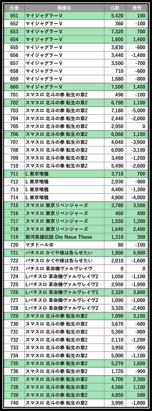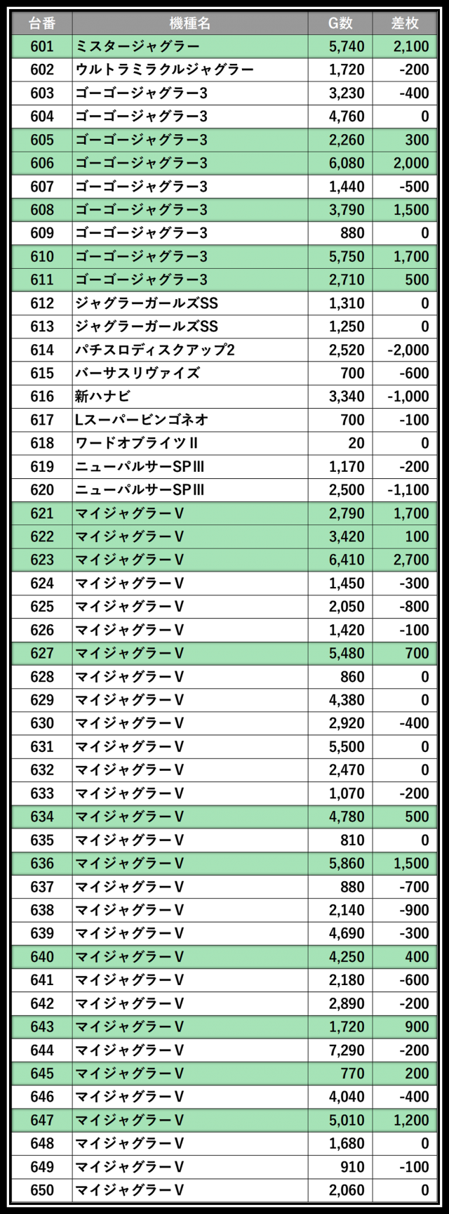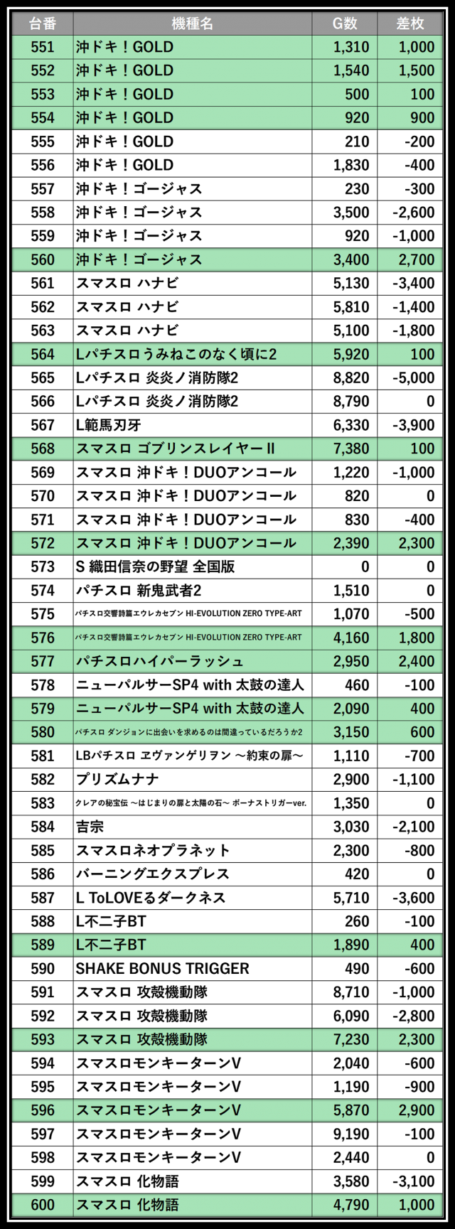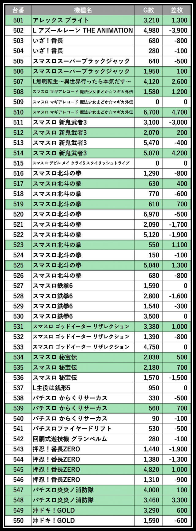 ※差枚数順に掲載しています