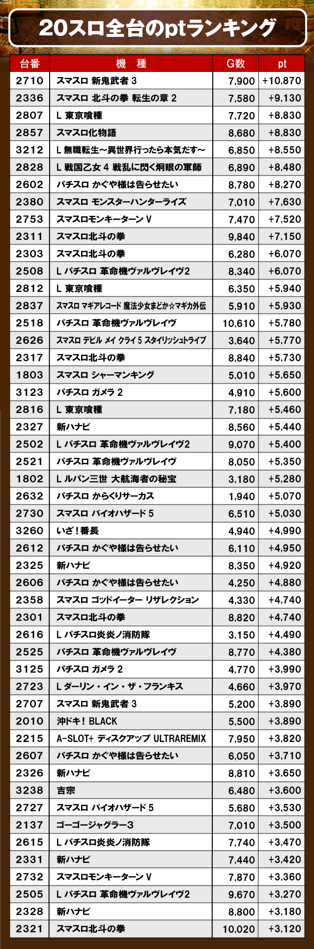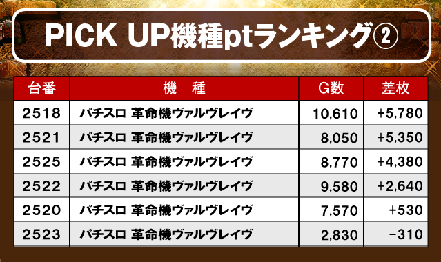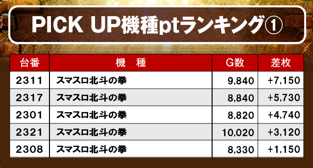 続いて、PICK UP機種のptランキングを見てみよう。『スマスロ北斗の拳』と『パチスロ 革命機ヴァルヴレイヴ』は、大台突破台を筆頭に4桁プラス台が多数発生し、大きく盛り上がっていた様子だ。且つしっかりと打ち込まれており、遊技していたファンが明らかな好感触を掴んでいたのは間違いないだろう!