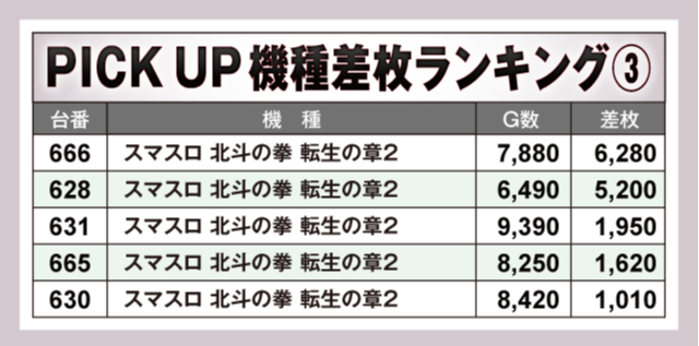 この日は、『パチスロ からくりサーカス』が+8,250枚、『スマスロ北斗の拳』が+6,080枚、『スマスロモンキーターンV』が+5,690枚を記録。さらに、『スマスロ 北斗の拳 転生の章2』から+6,280枚、+5,200枚が飛び出すなど、人気のAT機を中心に様々な機種からハイスコアが確認されている。