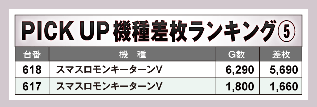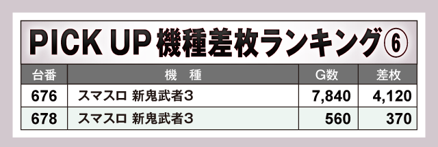 今回のPICK UP機種は全6機種。差枚上位にランクインした機種以外では『スマスロ 新鬼武者3』から+4,120枚が発生している。また、Aタイプ機種では『マイジャグラーⅤ』と『ネオアイムジャグラーEX』が大奮闘。プラス差枚で実戦を終えた台が続出しているだけに、ジャグラーファンにとっても大満足の一日となったはずだ。