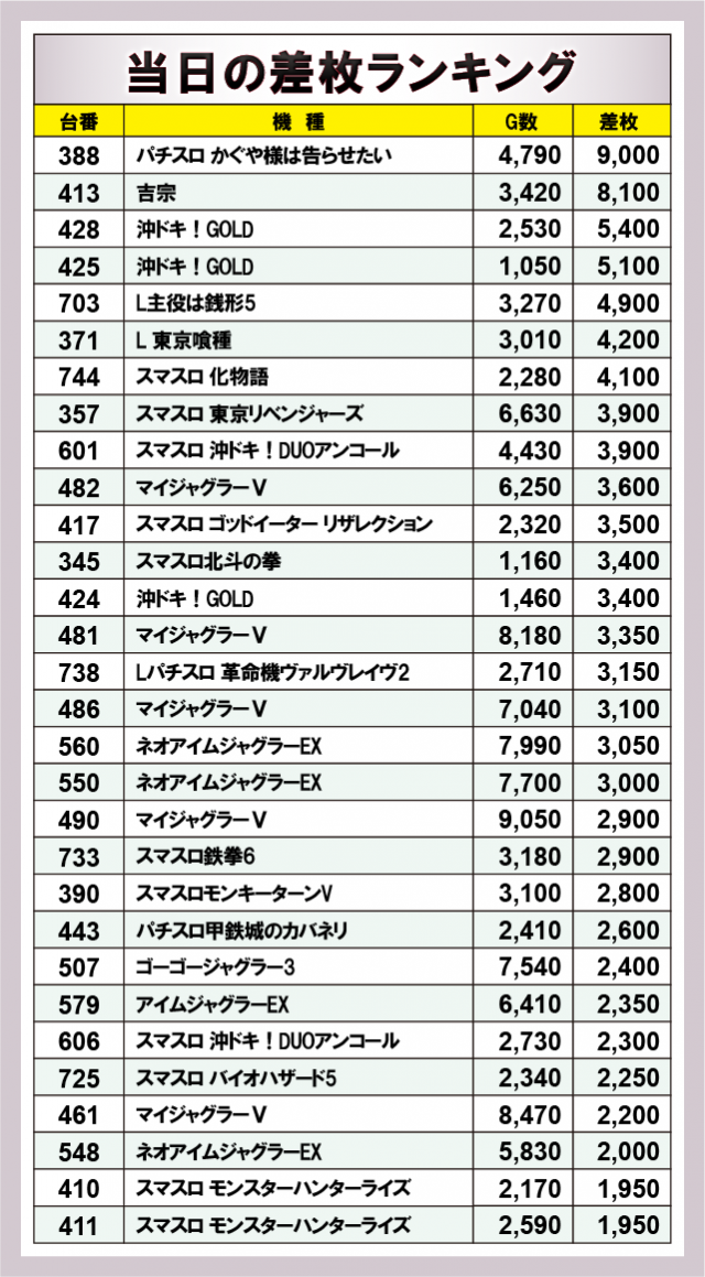 今回の差枚ランキングは、『パチスロ かぐや様は告らせたい』『吉宗』といった高差枚AT機が上位を牽引しつつ、『沖ドキ!GOLD』が複数台名を連ねるなど、機種単位での手応えも感じられる結果に。さらに『ジャグラー』シリーズも多数ランクインしており、スマスロ機・メダル機ともにチャンスが散りばめられていた様子が窺える。