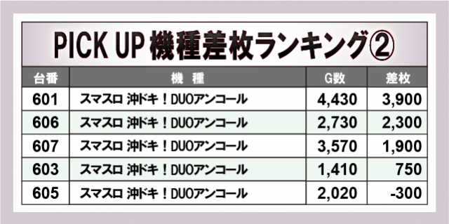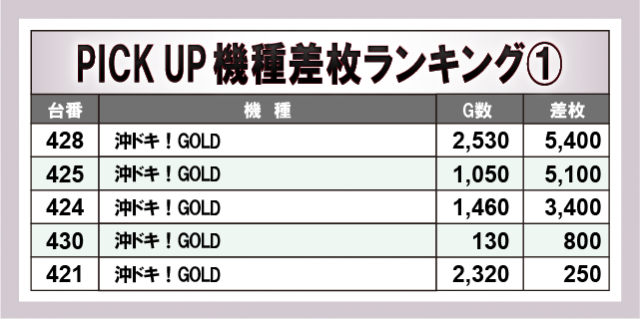 上表の5機種は活気と熱気に溢れており、当日の店内を盛り上げる存在になっていたのは間違いない。特筆すべきはどの機種も4桁差枚を複数台放出している所で、安定したパフォーマンスでファンは満足度の高い1日を過ごしていたのは確かだろう。