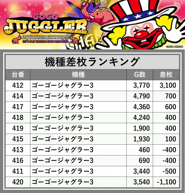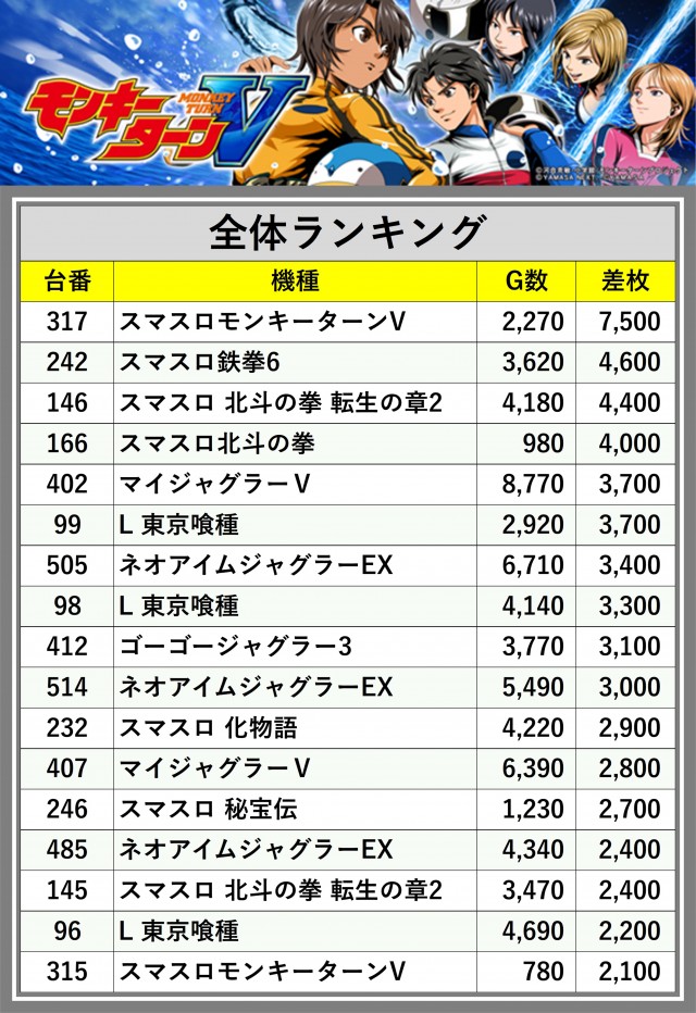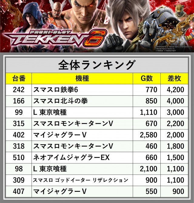 厳選された取材対象機種をはじめ、その他スロット全体から好記録が飛び出した!プレイヤーが楽しんだ1日を下記データにて振り返ってみて欲しい。