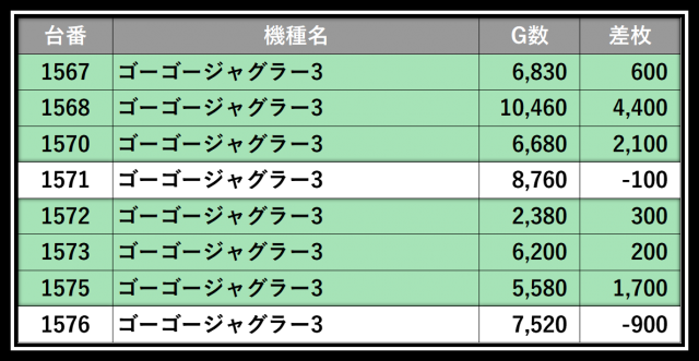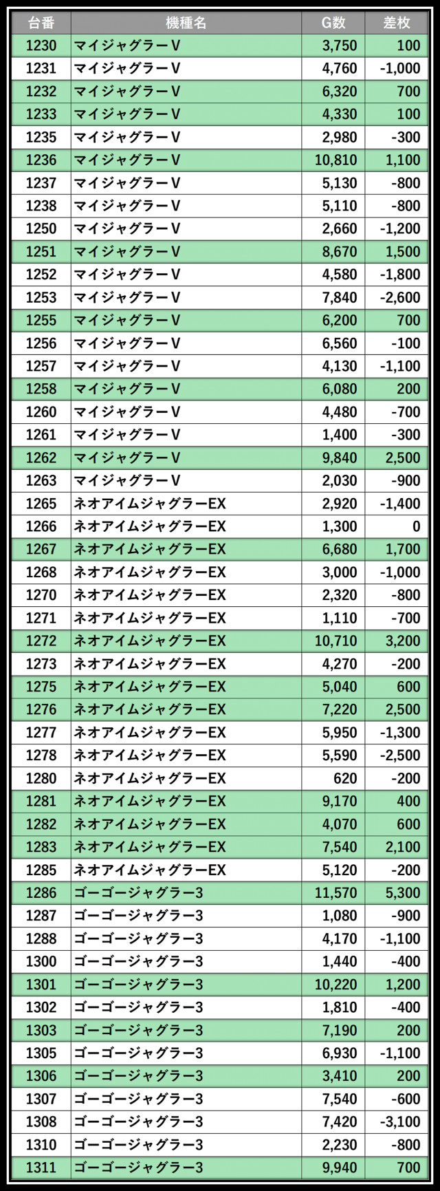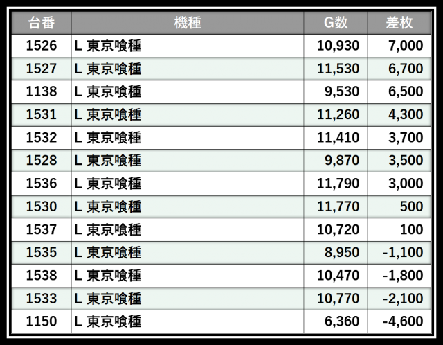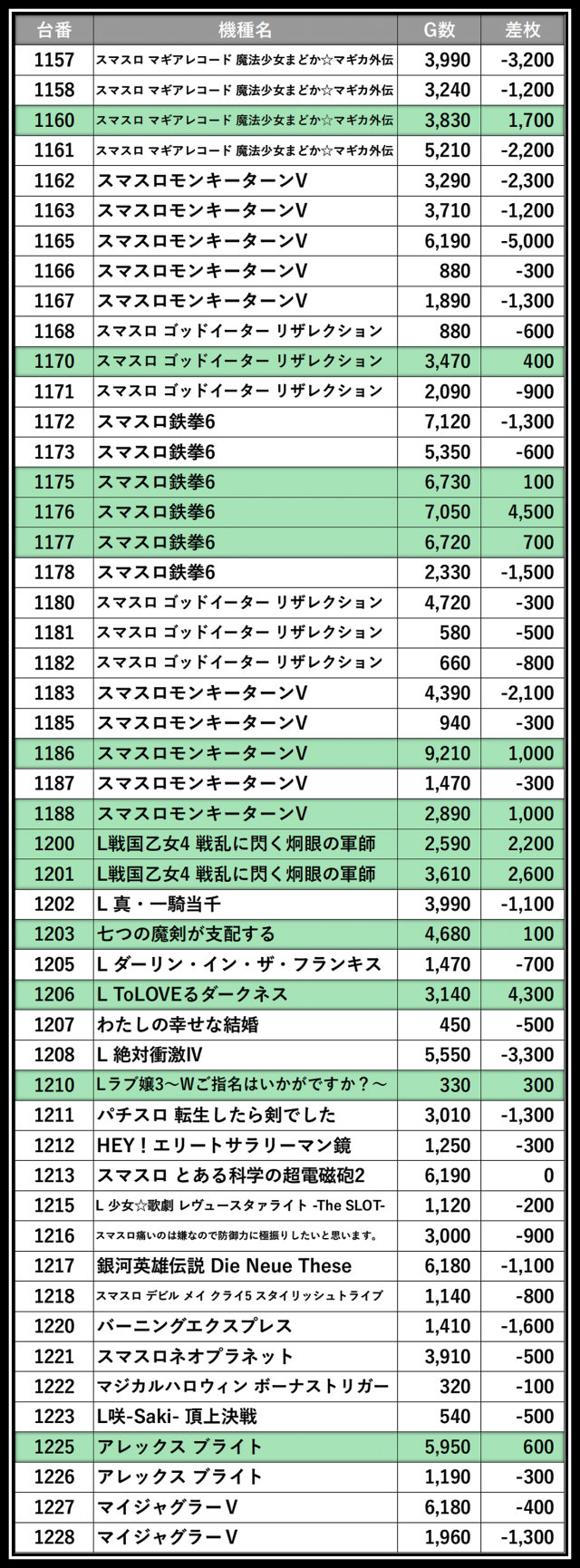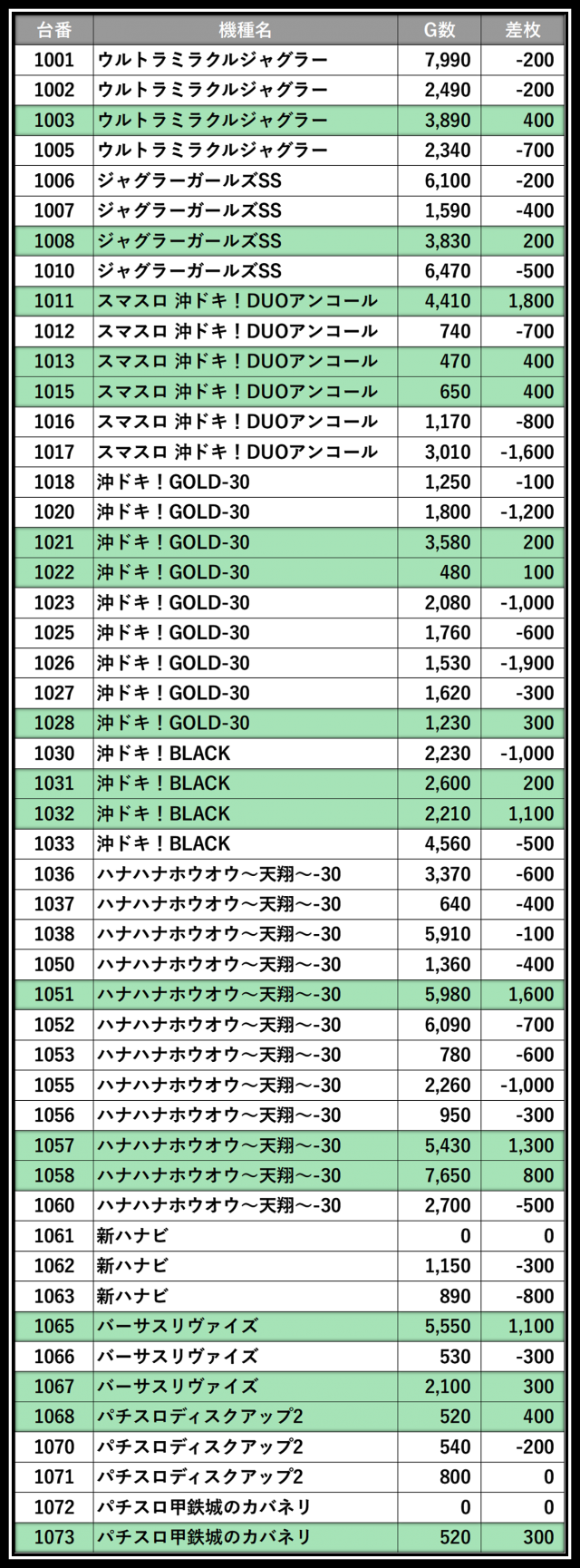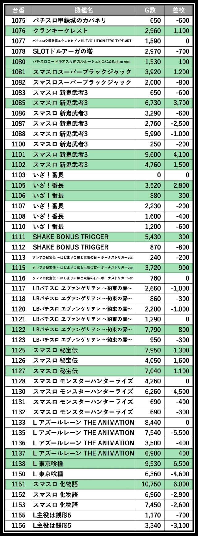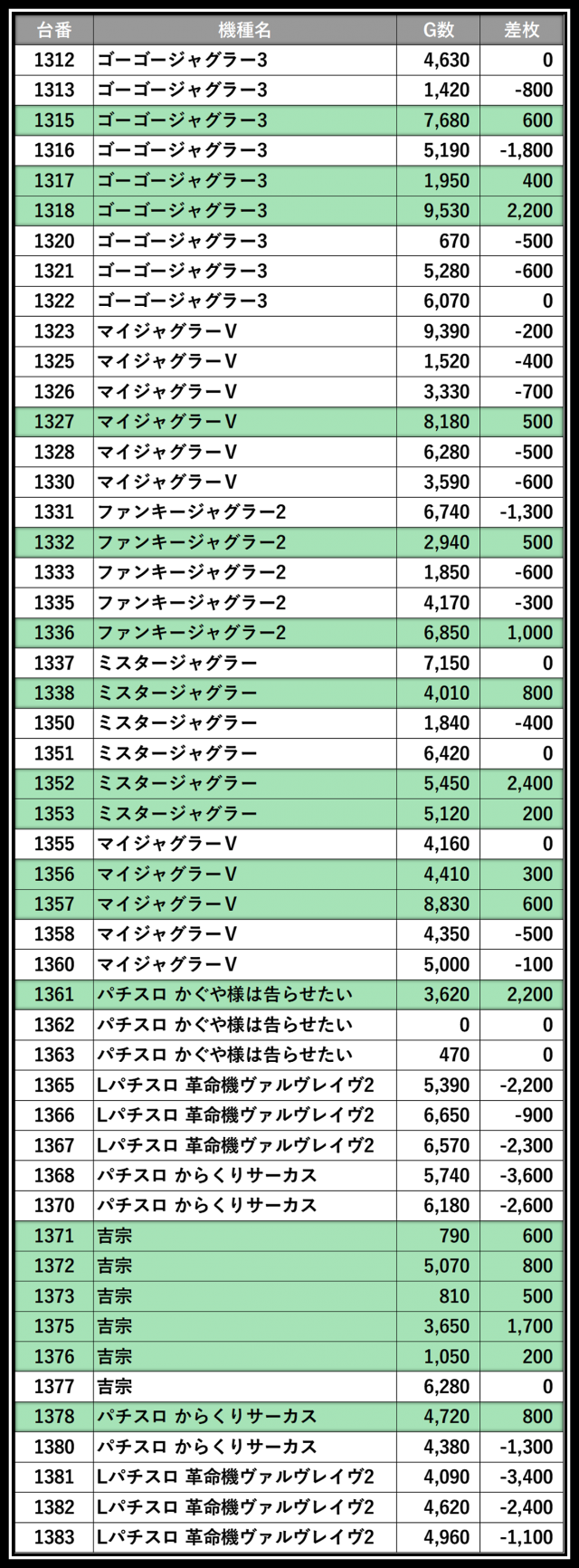 ※差枚数順に掲載しています