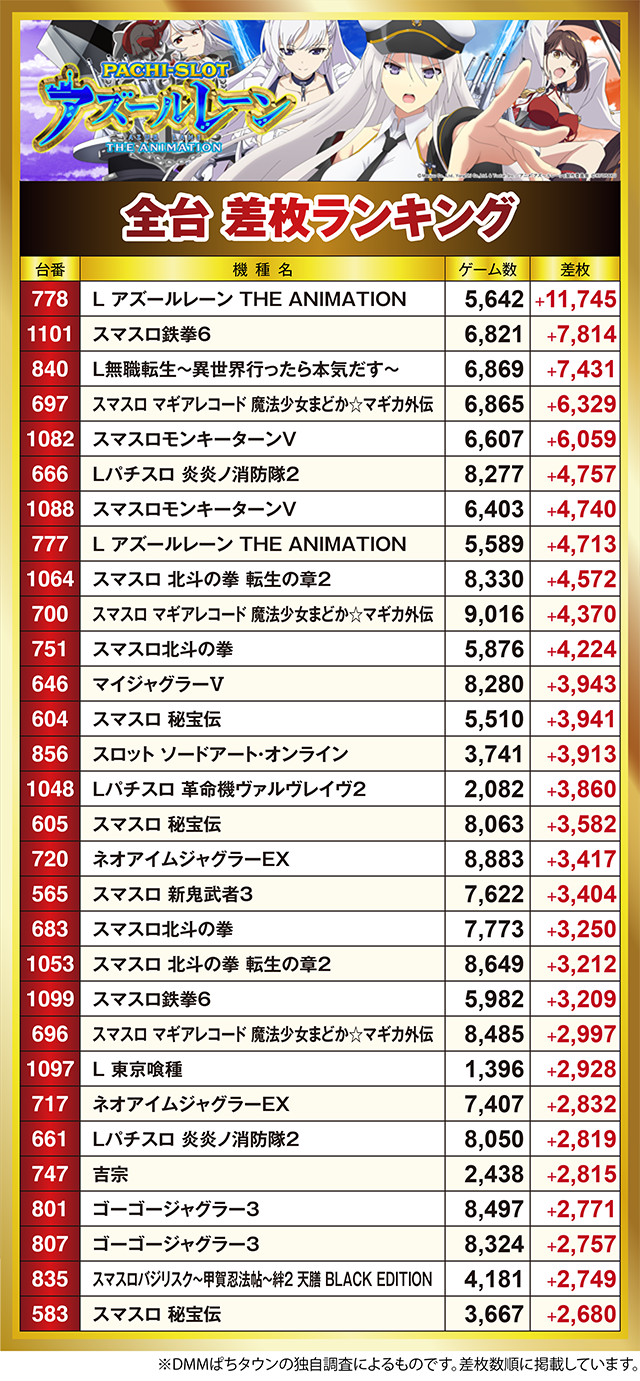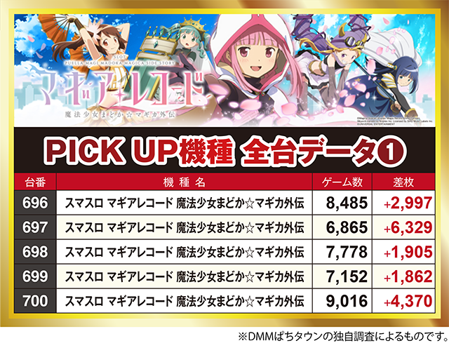 ほかにも、「スマスロ マギアレコード 魔法少女まどか☆マギカ外伝」の697番台や「スマスロモンキーターンV」の1082番台が+6,000ptを上回った。