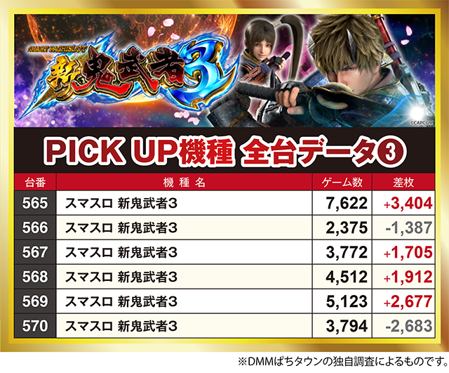 「スマスロ 新鬼武者3」は6台中4台が+1,900pt以上となり、565番台は+3,400pt超。