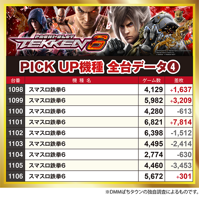 「スマスロ鉄拳6」も2台が+3,200pt以上となり、1101番台が+7,800ptオーバー。