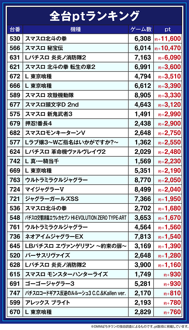 ほかにも、「スマスロ 北斗の拳 転生の章2」の621番台や「L 東京喰種」の672番台など、多くの台が約+3,000ptを上回った。