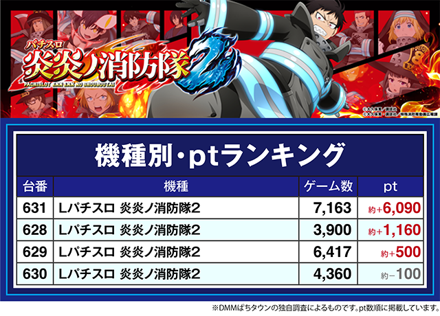 最新機種では、「Lパチスロ 炎炎ノ消防隊2」の631番台が約+6,000ptオーバー!!