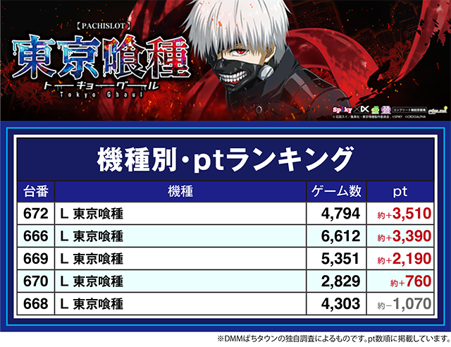 「L 東京喰種」では、672番台と666番台が約+3,300ptオーバー!