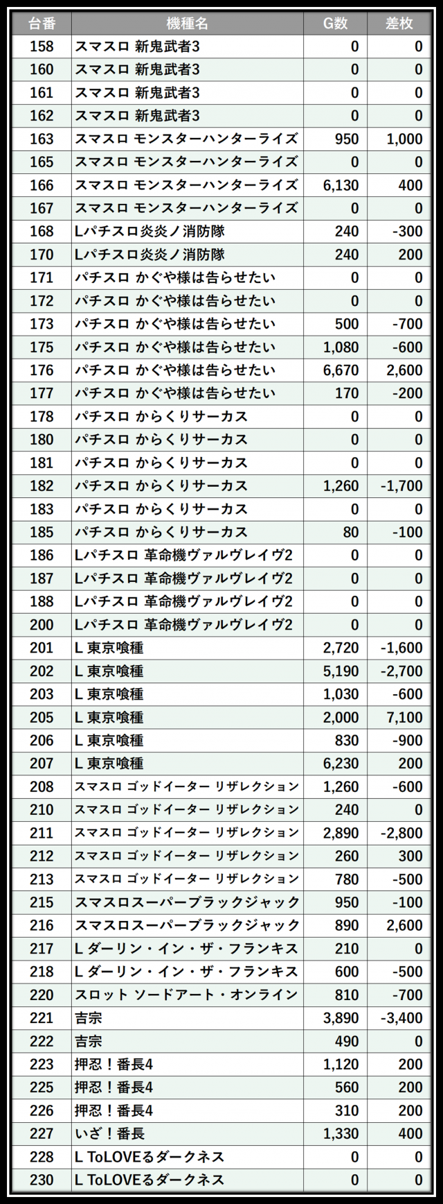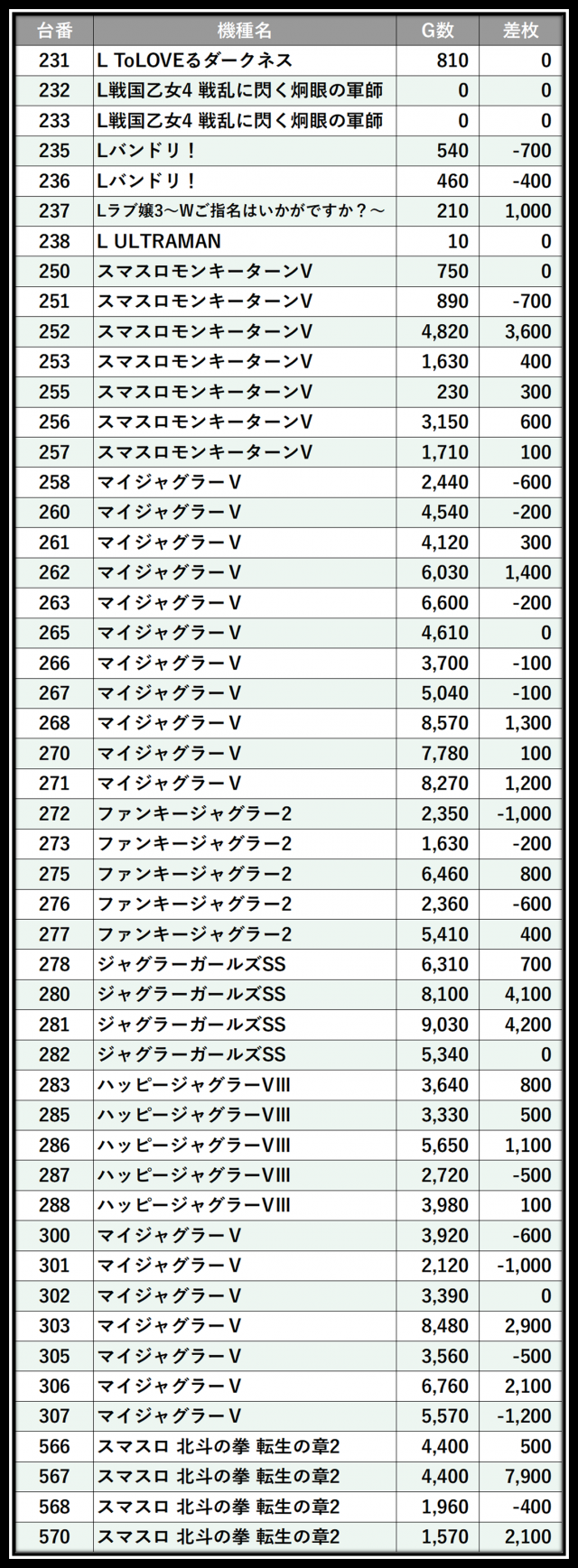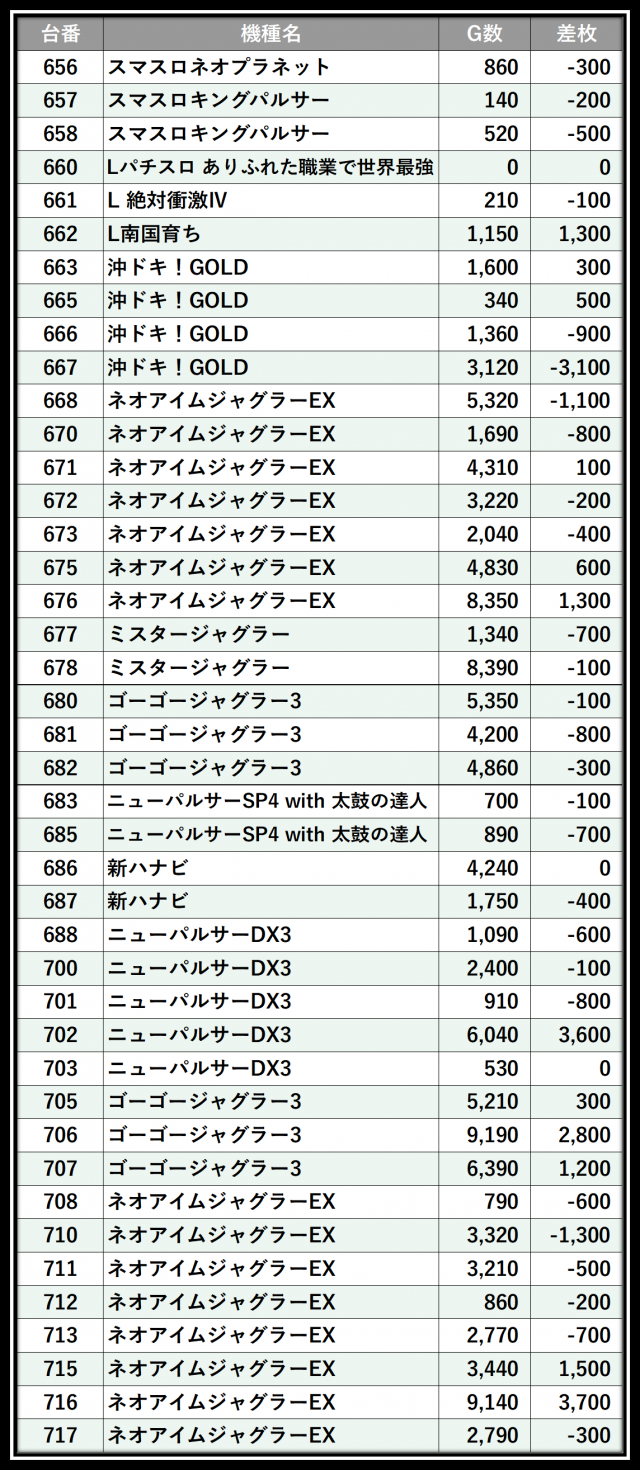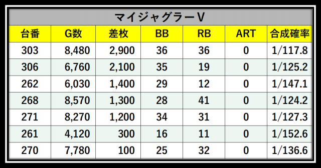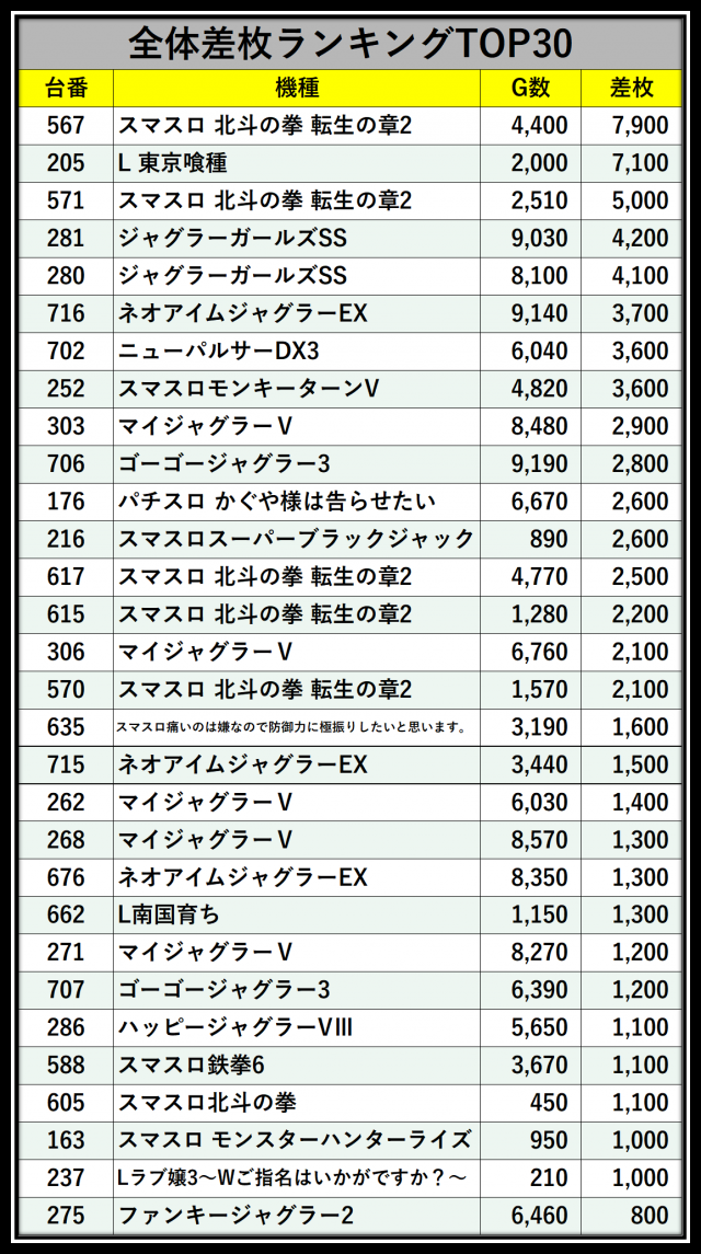 ※差枚数順に掲載しています