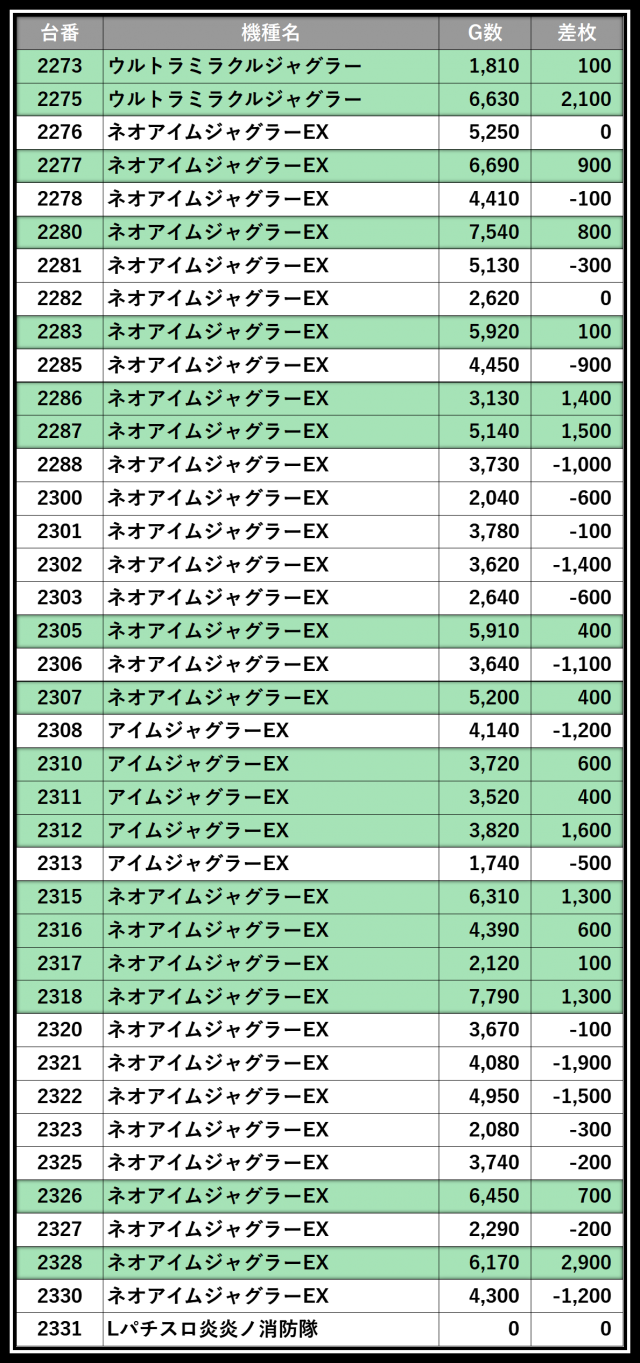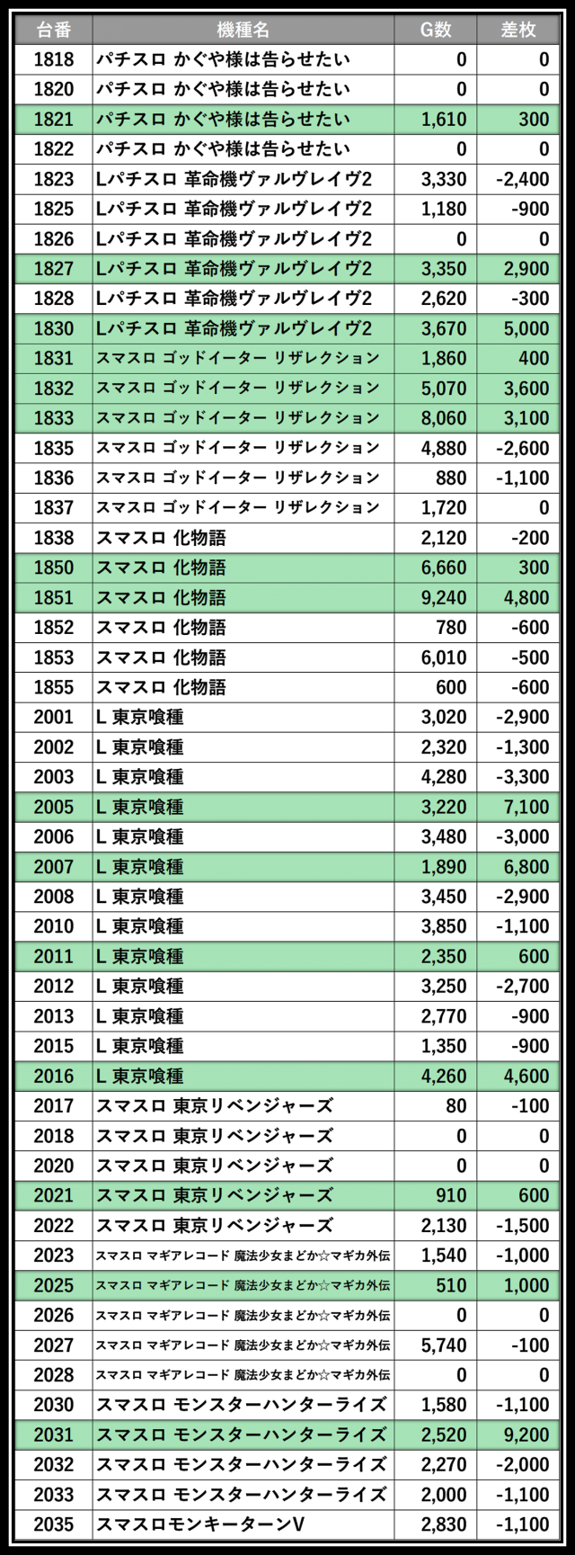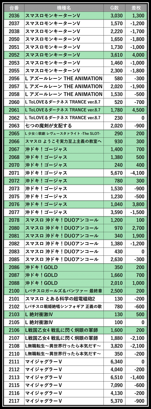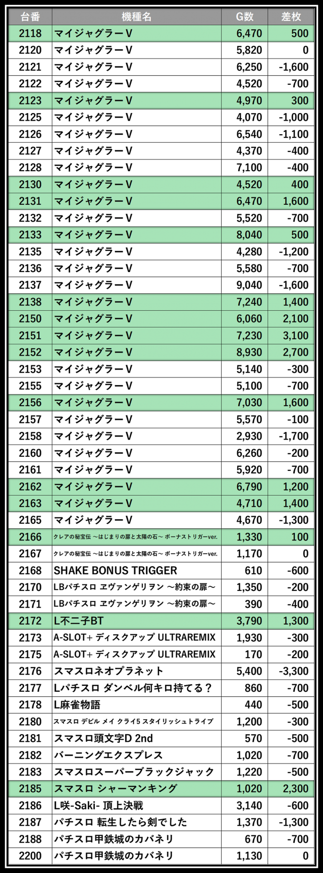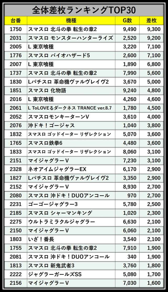 ※差枚数順に掲載しています