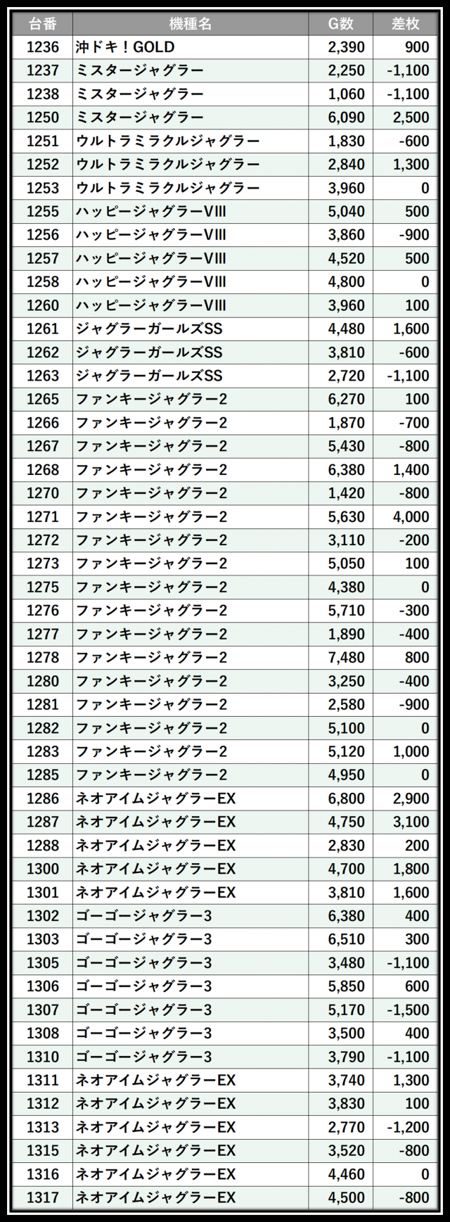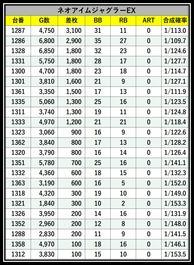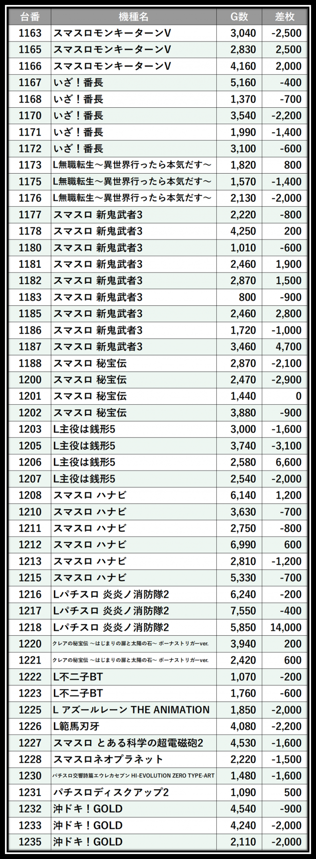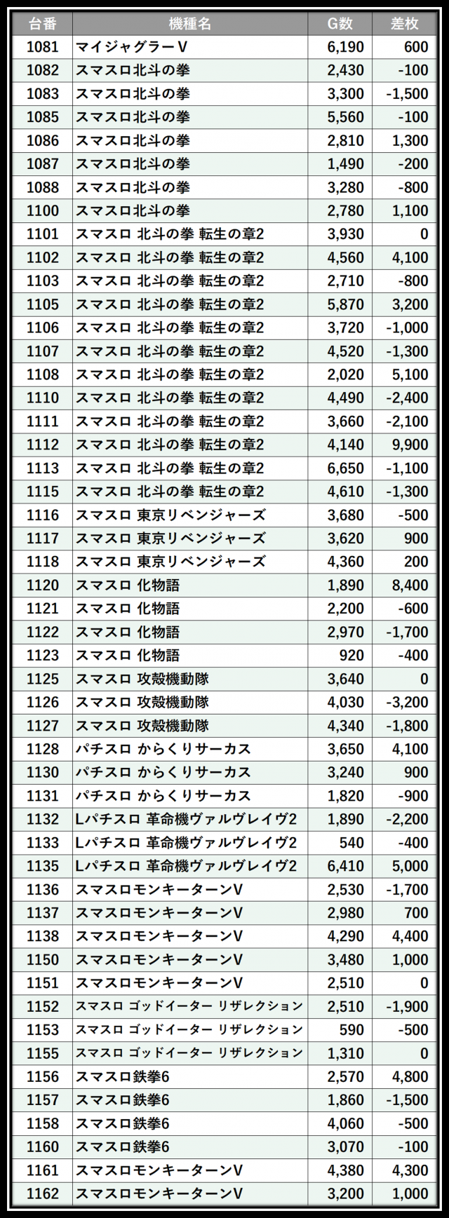 ※差枚数順に掲載しています