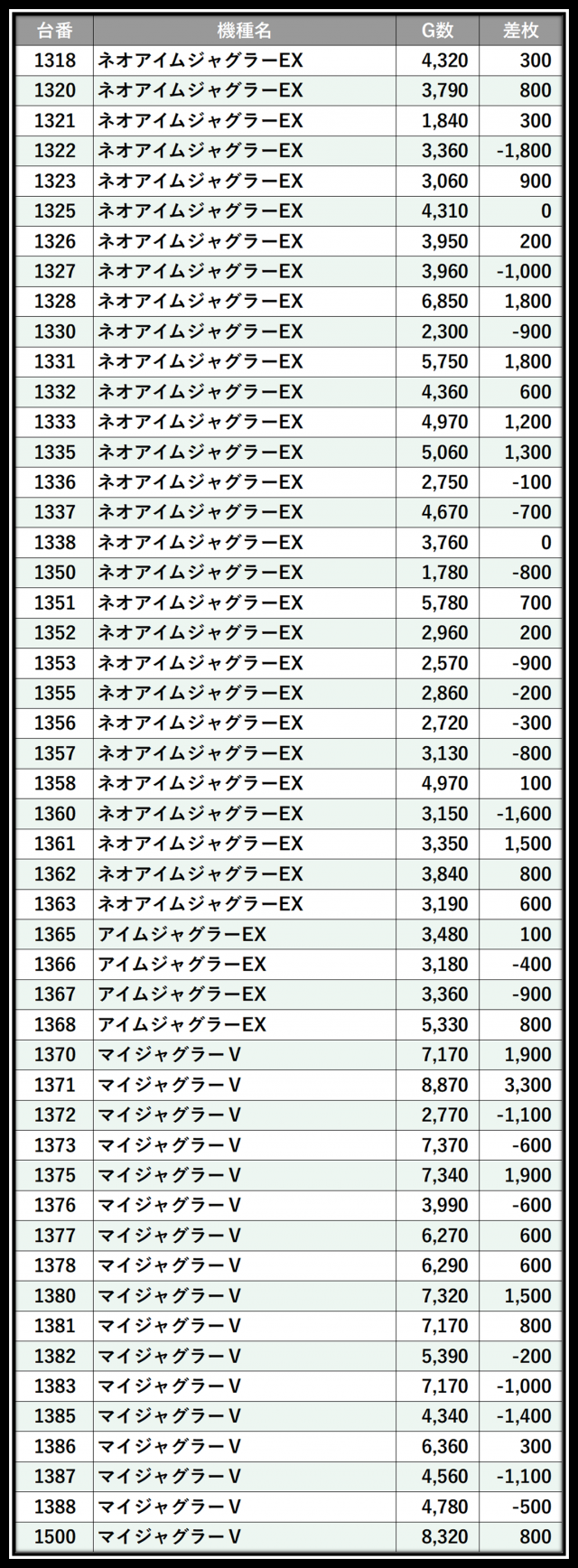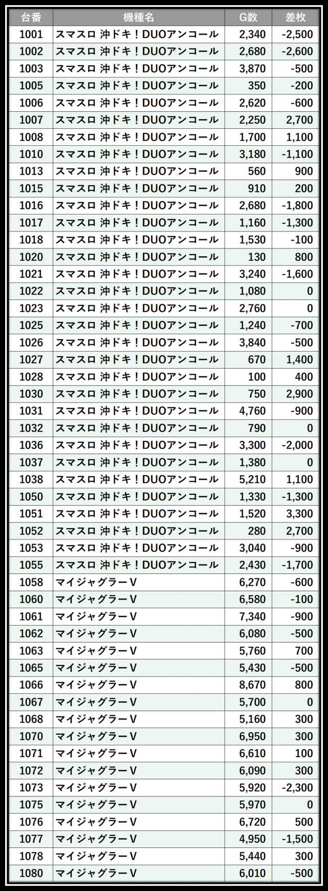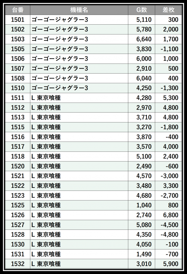 ※差枚数順に掲載しています