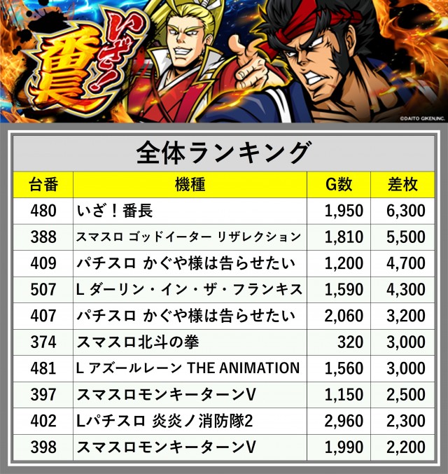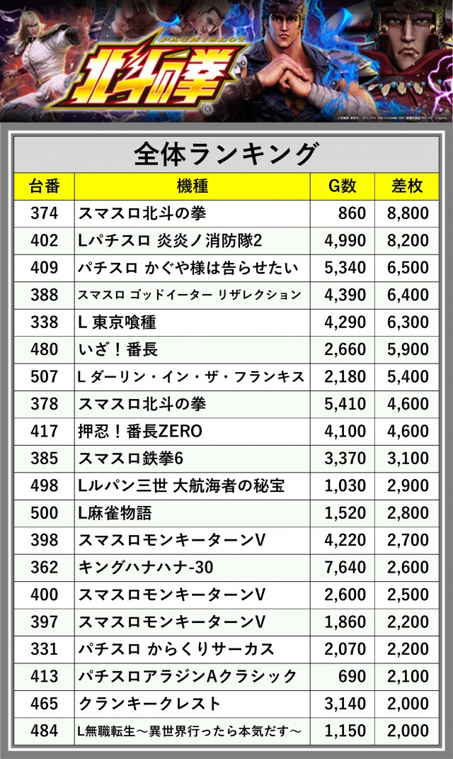 ※差枚数順に掲載しています