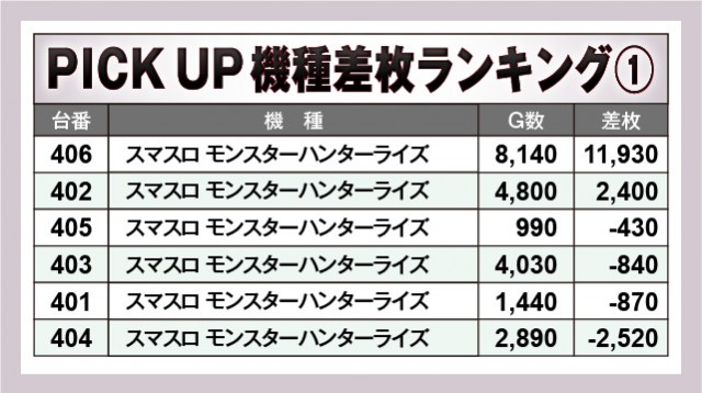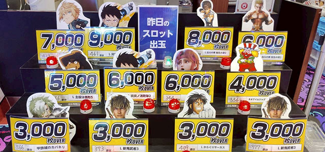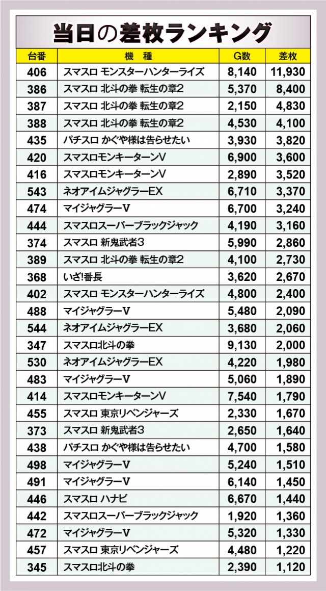 『スマスロ モンスターハンターライズ』にて11,930枚が飛び出し、店内の盛り上がりを大きく牽引。その後ろには『スマスロ 北斗の拳 転生の章2』がズラリと名を連ねており、存在感を放っていたのも見逃せない。もちろん『ジャグラー』シリーズもコンスタントに大当りを積み重ねた結果、複数台が回転数と差枚数が比例する展開を披露。スペック問わず幅広い機種が活躍した1日で、ファンは有意義な時間を過ごしていたはずだ。