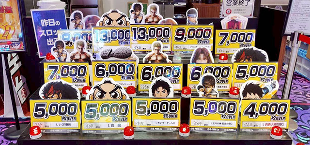 『スマスロ 北斗の拳 転生の章2』にて12,830枚と大きな熱気が放たれ、店内の盛り上がりを大きくリードしていた。さらに『スマスロ 新鬼武者3』『スマスロモンキーターンV』も大台突破を果たしており、ファンは右肩上がりに伸びる出玉を前にして、笑顔を浮かべていたのも見逃せない。また『ジャグラー』シリーズの活躍も目立っており、各所で回転数と差枚数が比例する展開を披露していたのも鮮烈であるばかりだ。