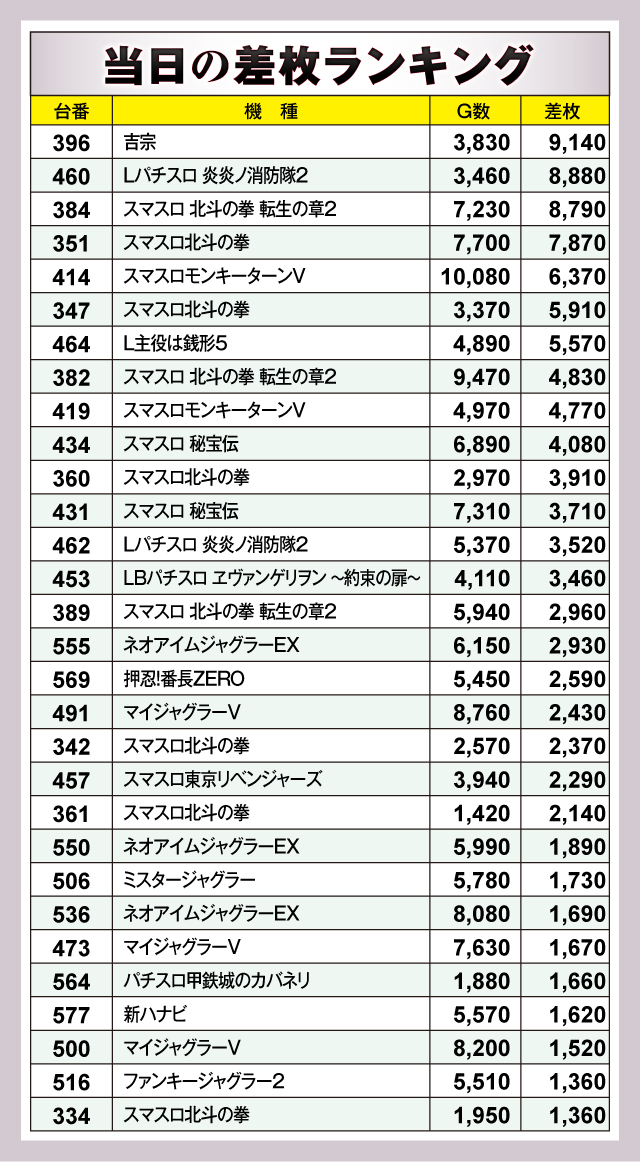 まずは当日の差枚ランキングから、店内の熱気を紐解いていく。この日、もっとも輝きを放ったのは396番台の「吉宗」だ。差枚数は見事+9,140枚を記録し、万枚目前という圧倒的な出玉力を見せつけた。さらに460番台の「Lパチスロ 炎炎ノ消防隊2」から+8,880枚、384番台の「スマスロ 北斗の拳 転生の章2」からは+8,790枚と、ランキング上位は怒涛の出玉ラッシュ! どの台もあと一歩で万枚という凄まじいポテンシャルを発揮し、店内のボルテージは最高潮に達していたようだ!