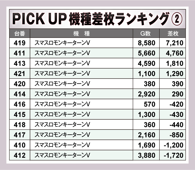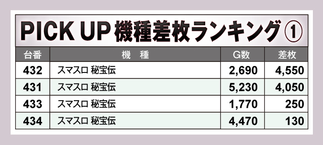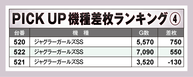 続いて、ピックアップ機種たちの盛り上がりについて触れていきたい。特筆すべきは「スマスロモンキーターンV」で、419番台の差枚+7,210枚という結果とともに、ファンが確信を持ってレバーを叩き続けた熱意が伝わってくる。また、「スマスロ 秘宝伝」も432番台が+4,550枚、431番台が+4,050枚と複数台が上位にランクインしており、機種単位での状況の良さを感じさせた。その他、「L主役は銭形5」や「ジャグラーガールズSS」なども素晴らしい結果を残しており、店内の至る所にチャンスが潜んでいたのは間違いない!
