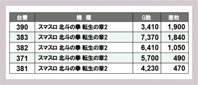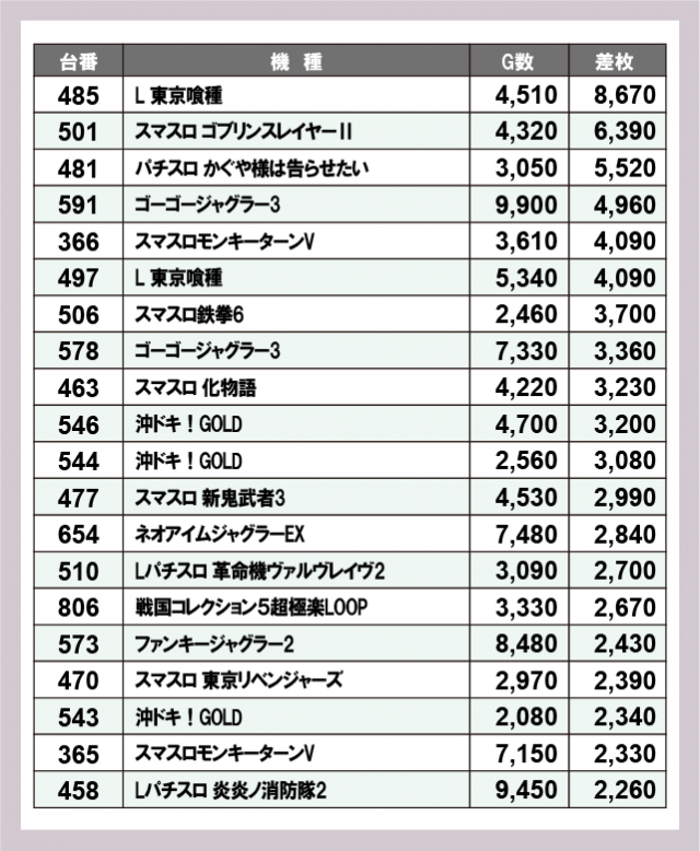 ※差枚数順に掲載しています