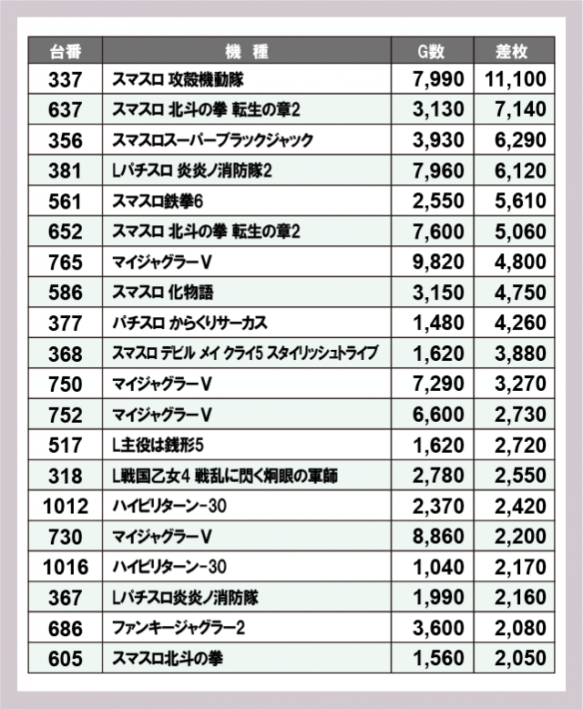 ※差枚数順に掲載しています