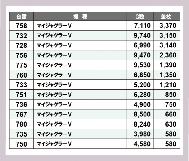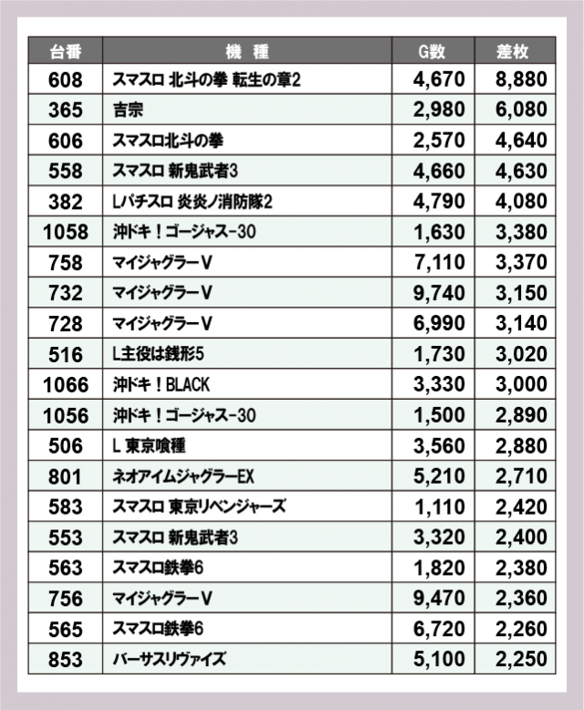 ※差枚数順に掲載しています