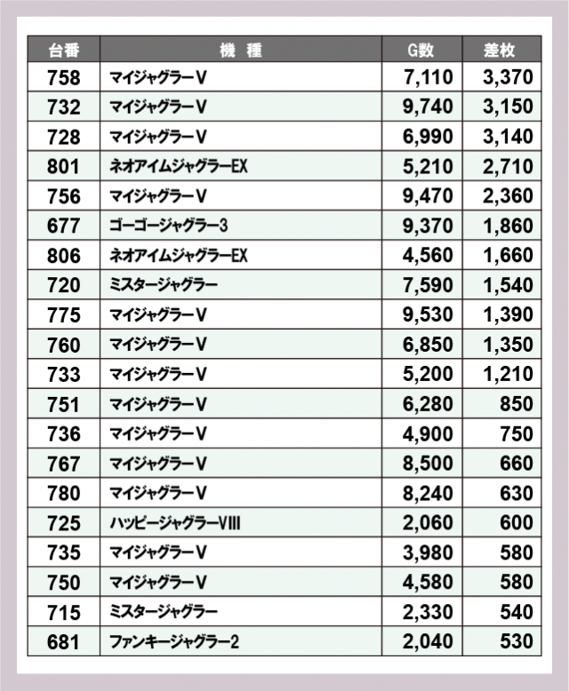 ジャグラー差枚ランキング