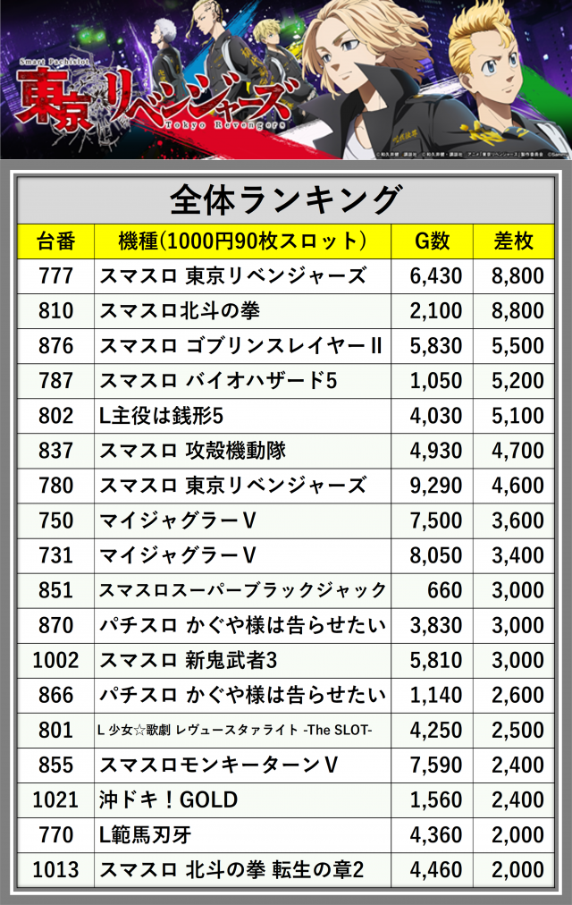厳選された取材対象機種をはじめ、その他スロット全体から好記録が飛び出した!プレイヤーが楽しんだ1日を下記データにて振り返ってみて欲しい。