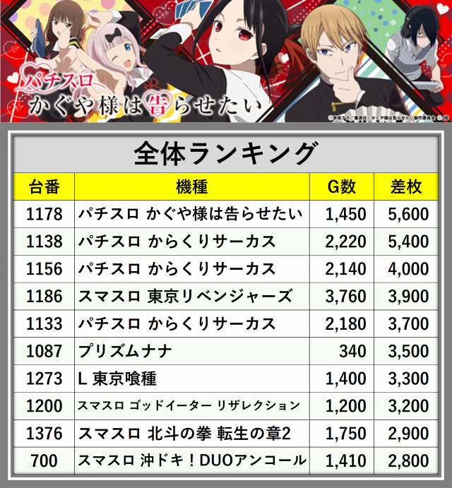 ※差枚数順に掲載しています