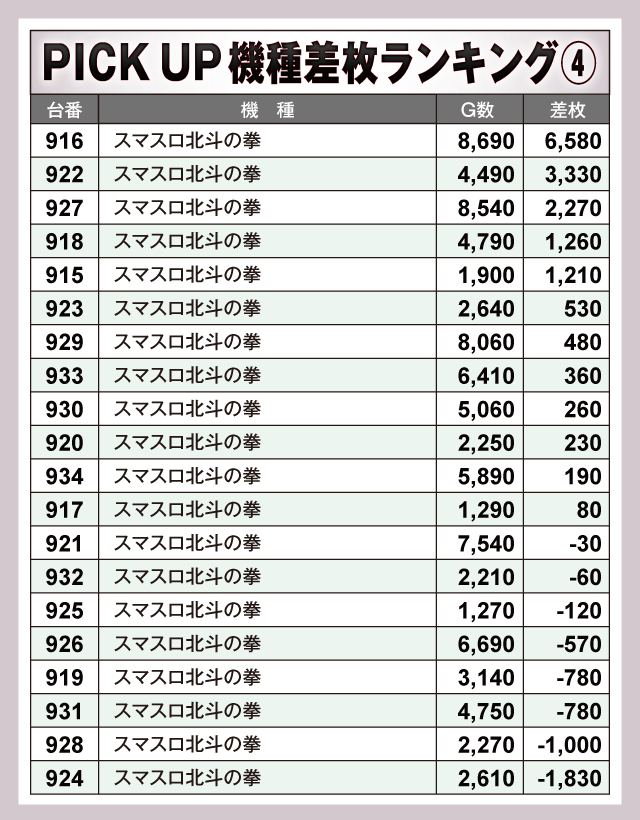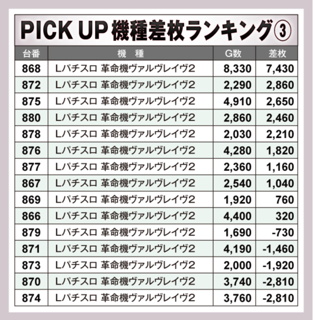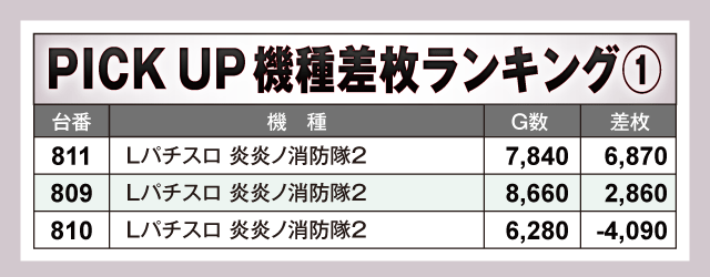 この日は、『Lパチスロ 革命機ヴァルヴレイヴ2』が+7,430ptを叩き出し差枚ランキングのトップに輝いている。続いて、話題の新台『Lパチスロ 炎炎ノ消防隊2』が+6,870ptを記録。そのポテンシャルの高さを早くも披露しプレイヤーの注目を集めていた。また、他にも様々な機種から+5,000pt超が続出しているだけに、広範囲に渡ってチャンスが潜んでいたのは間違いないだろう。