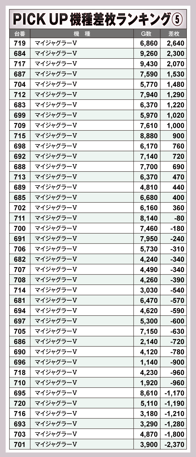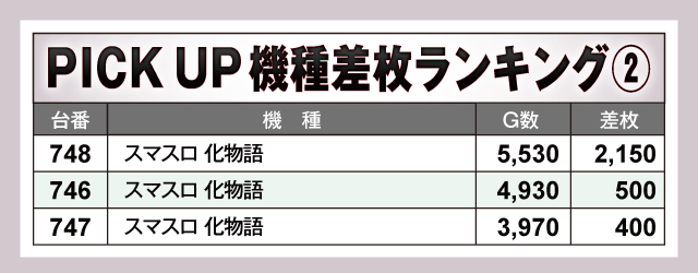 次にPICK UP機種の状況をチェックしていくと、差枚上位にランクインした『Lパチスロ 革命機ヴァルヴレイヴ2』と『Lパチスロ 炎炎ノ消防隊2』以外にも多数の好調台を確認。『スマスロ北斗の拳』からは+6,580ptが発生、『スマスロ 化物語』は3台全てがプラス差枚となる見事な結果を残している。そして、同店の看板機種の一つである『マイジャグラーⅤ』からもプラス差枚台が大量発生しファンを喜ばせていた。
