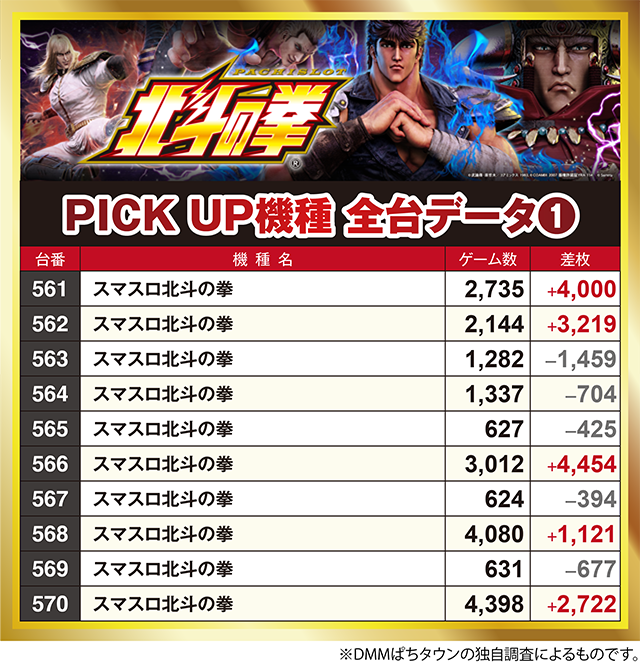 5台が+1,100ptを超えた「スマスロ北斗の拳」では、566番台が+4,500ptクラスとなった。