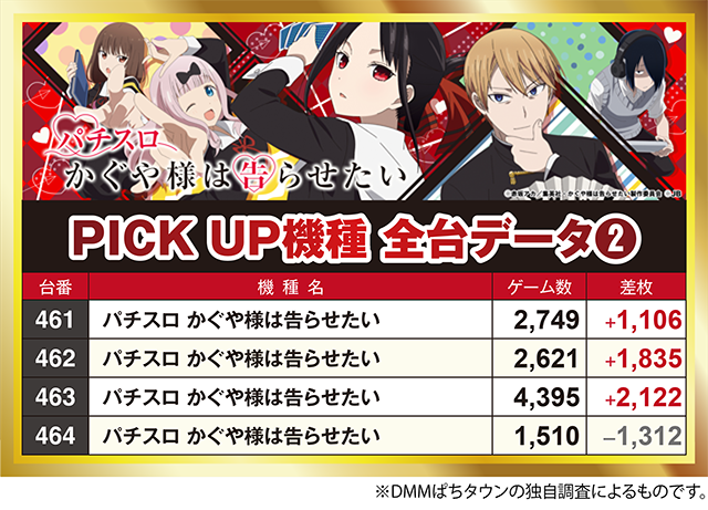 「パチスロ かぐや様は告らせたい」では、463番台が+2,122pt。