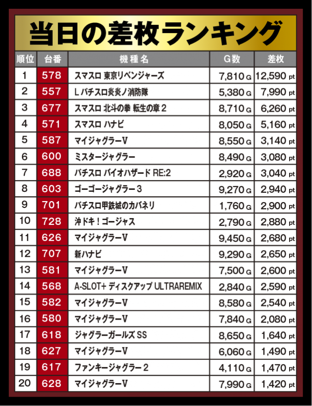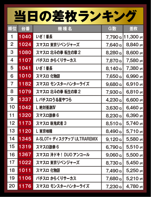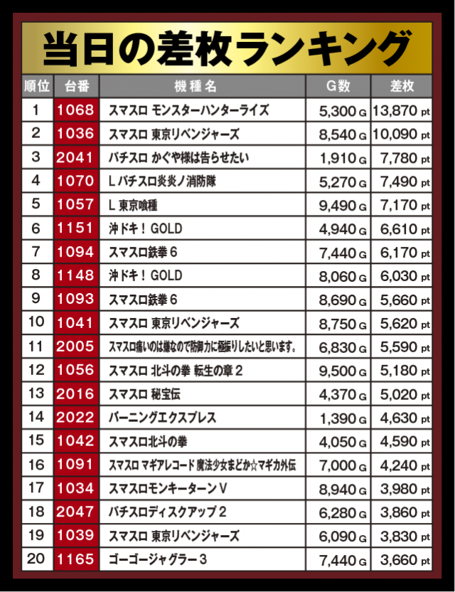 この日のSAPグループはひと味違う。DMMぱちタウンは、東京都内SAPの特別な3日間を一斉取材した。特に華々しい活躍を残した機種たちをピックアップして紹介しよう。まずは「SAP北野」差枚ランキングの発表だ!