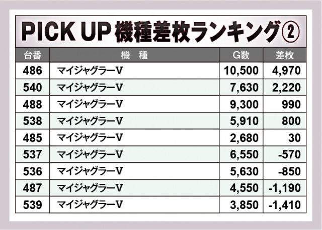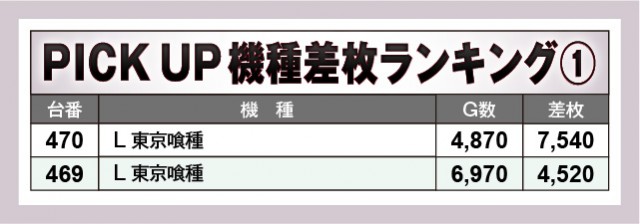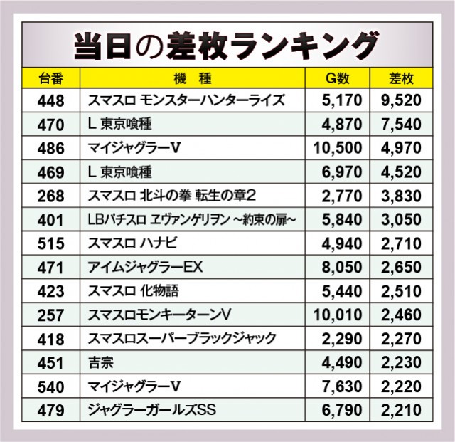 上表の4機種はいずれもまとまった出玉を確保しており、回転数も相まって、ファンは可能性を見出していたことだろう。『L 東京喰種』の7,540枚という熱量に驚かされるが、特に『マイジャグラーⅤ』では万回転台も飛び出していることから、そのポテンシャルは確かなようだ。回転数と差枚数が比例する展開を披露しており、ファンは有意義な時間を過ごしていたのは間違いない。