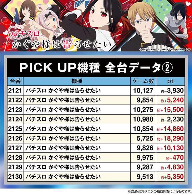 「パチスロ かぐや様は告らせたい」では、4台が約+10,000ptオーバー!!