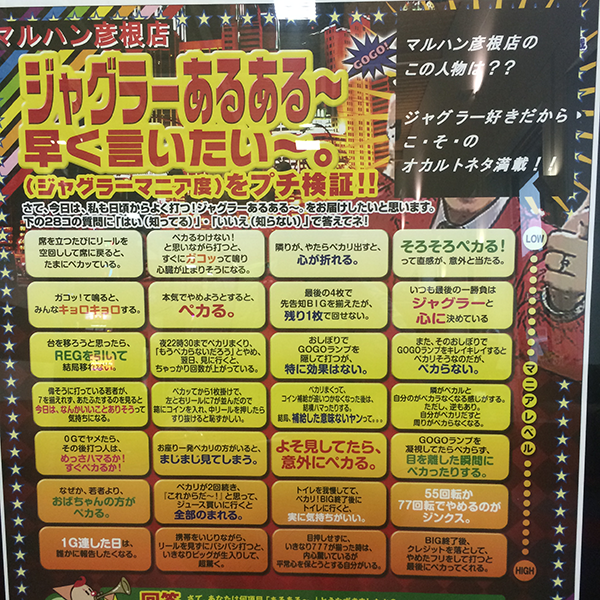 導入予定の機種を店長が解説している看板やジャグラーあるあると題されたボードといった、ほかでは見られないひと工夫された面白いPOPなども、プレイヤーにとって遊技の楽しみの1つとなっていることだろう。