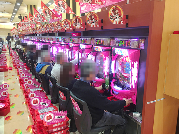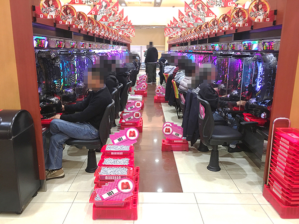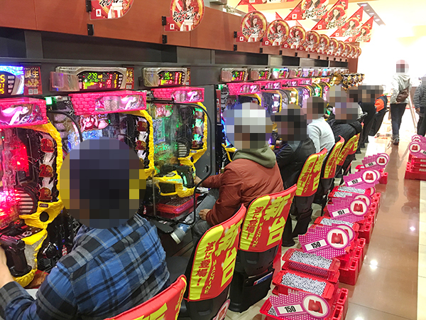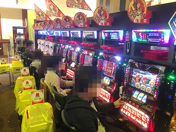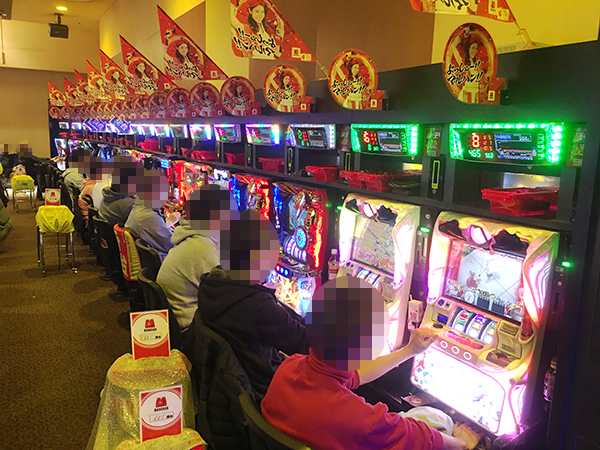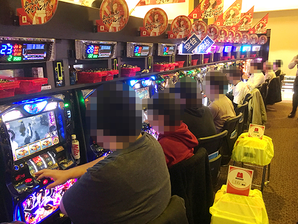 取材時は既に多くのプレイヤーが集結。パチンコ・パチスロを問わず、にぎやかな雰囲気となっていた。