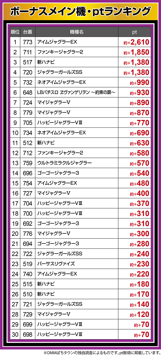 『ネオアイムジャグラーEX』の732番台も約+1,000ptクラスとなった。